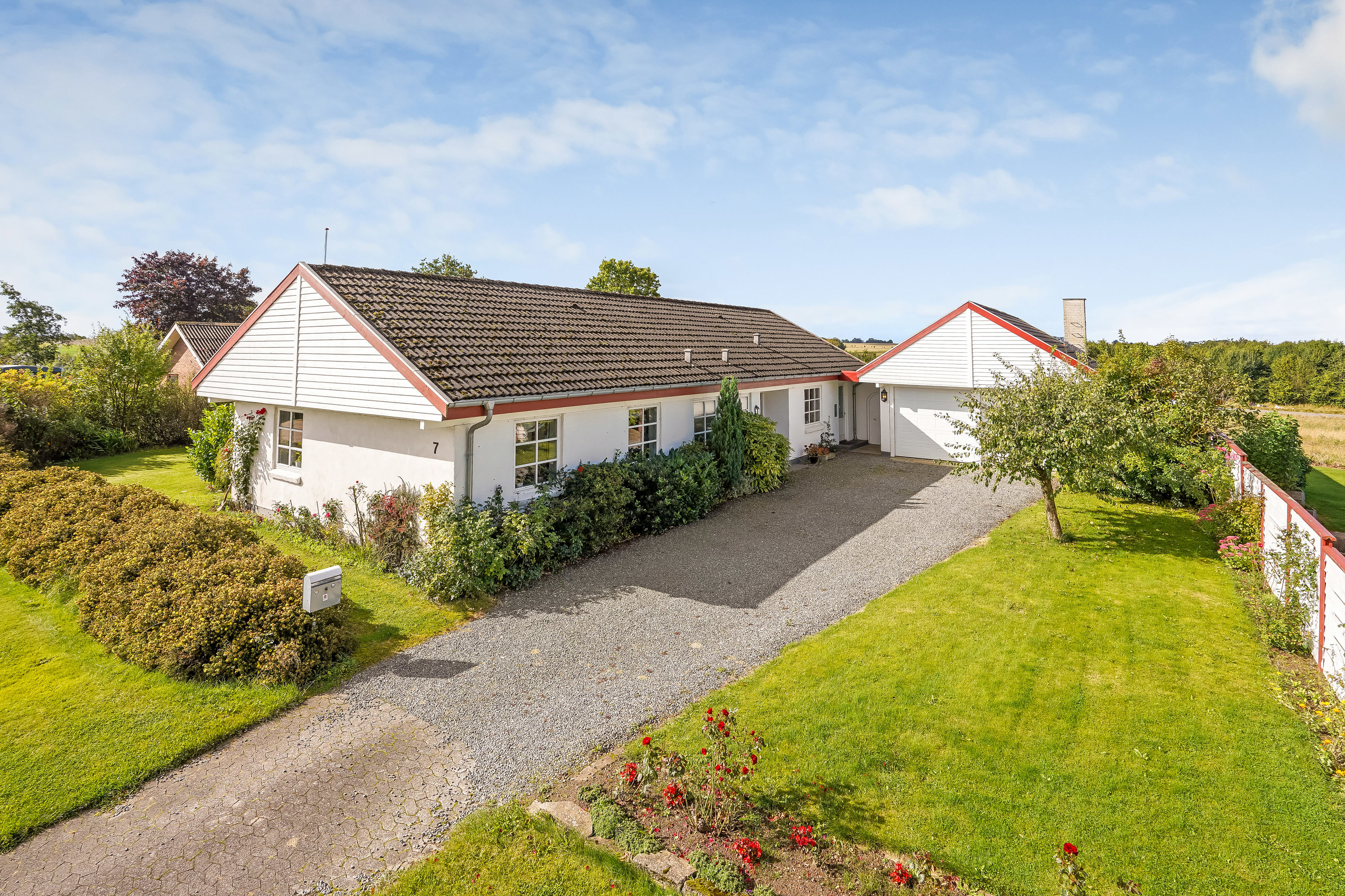 Villa på 168 m² fra 1977 med en grund på 1.114 m² præsenterer sig med klassisk hvid facade, stor indkørsel og tilknyttet dobbeltgarage.