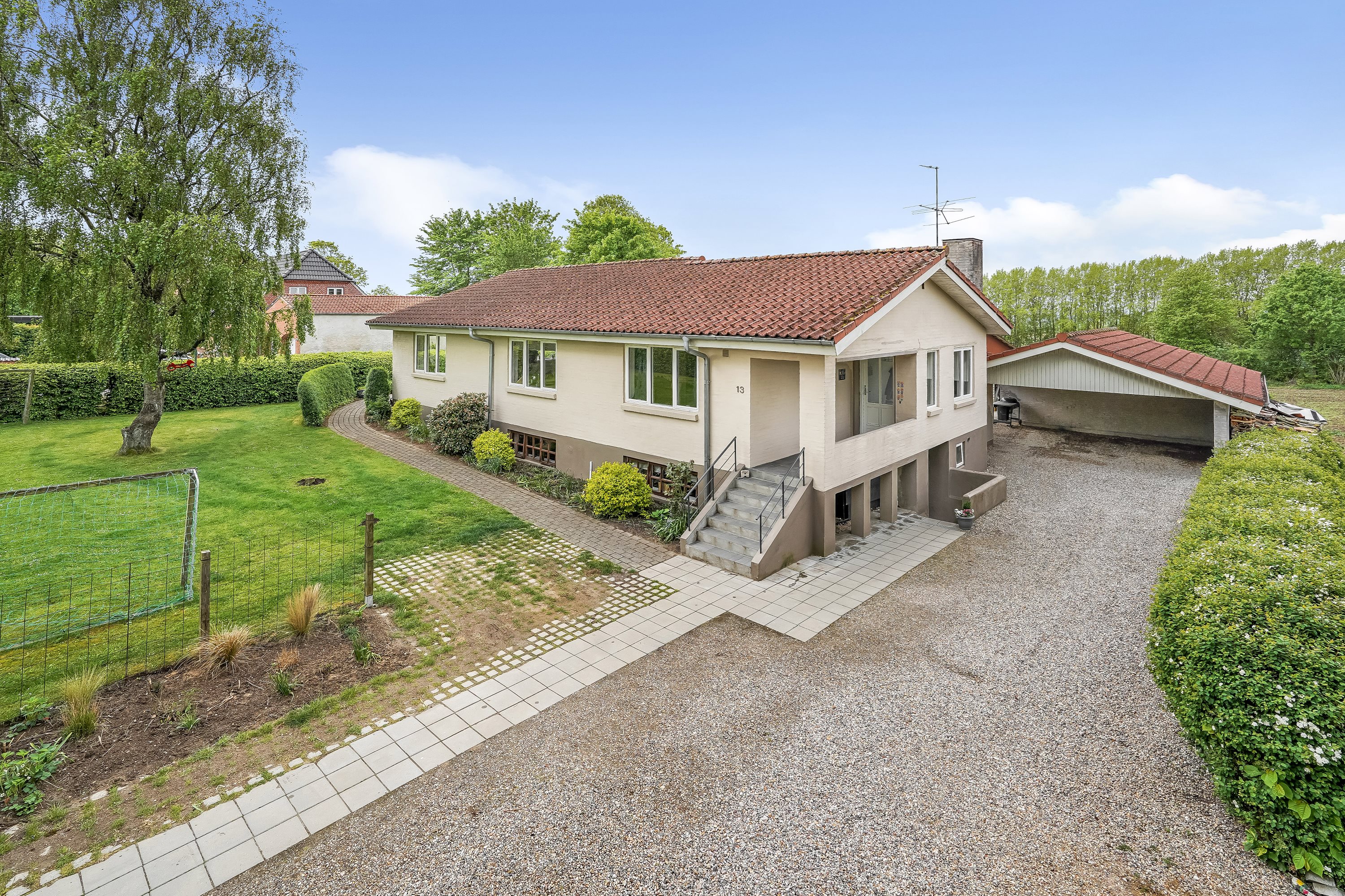 Udenfor er en dejlig have, hvor solen kan nydes dagen lang. Ydermere er der en stor carport med plads til to biler, samt et skur hvor diverse haveredskaber, cykler og meget mere kan stå i læ for vind og vejr.