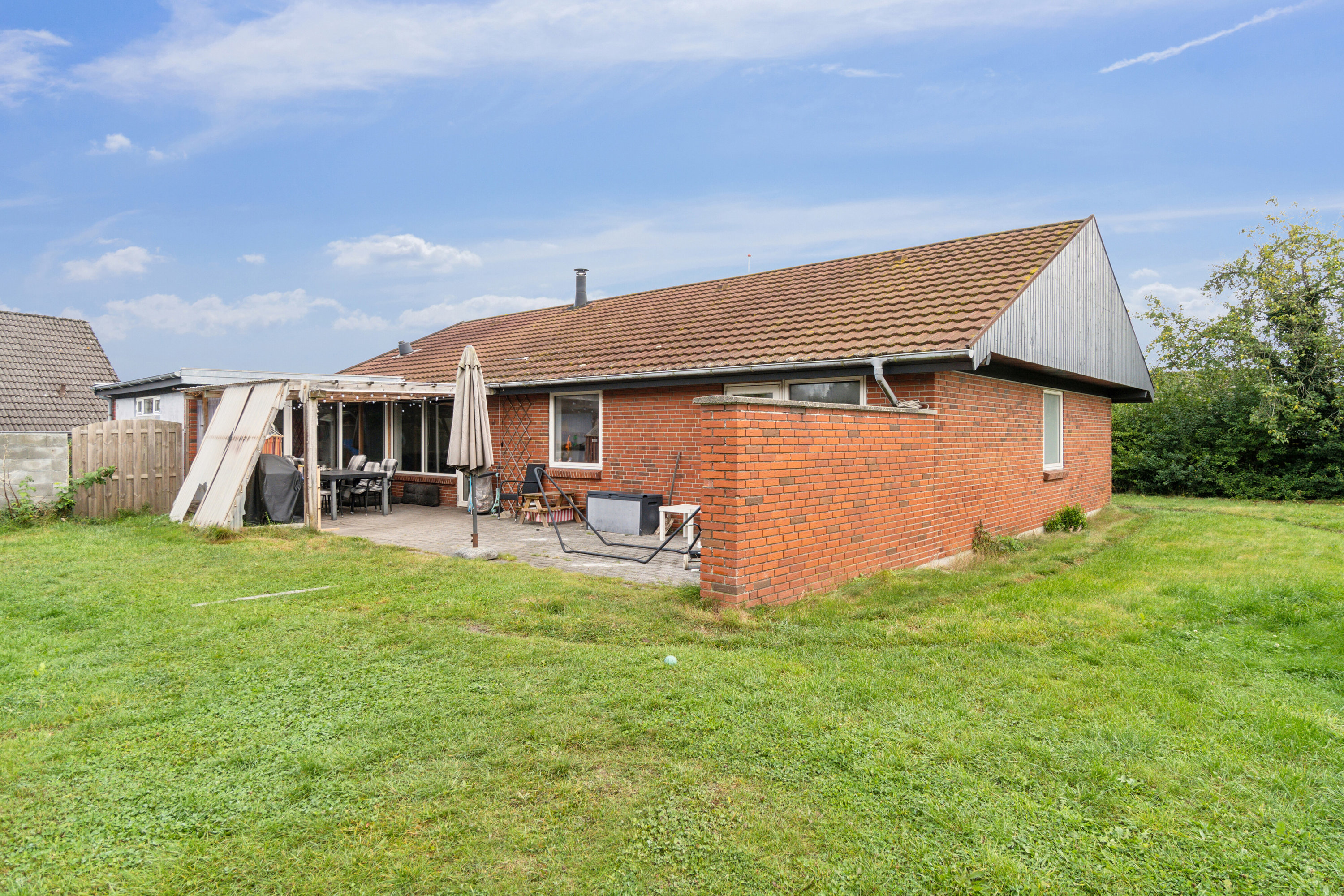I kommer aldrig til at savne solen ude i den dejlige have, som strækker sig over en fliseterrasse og en græsplæne med plads til børnenes legeredskaber. Fortil på grunden finder I garagen med tilstødende holdeplads.