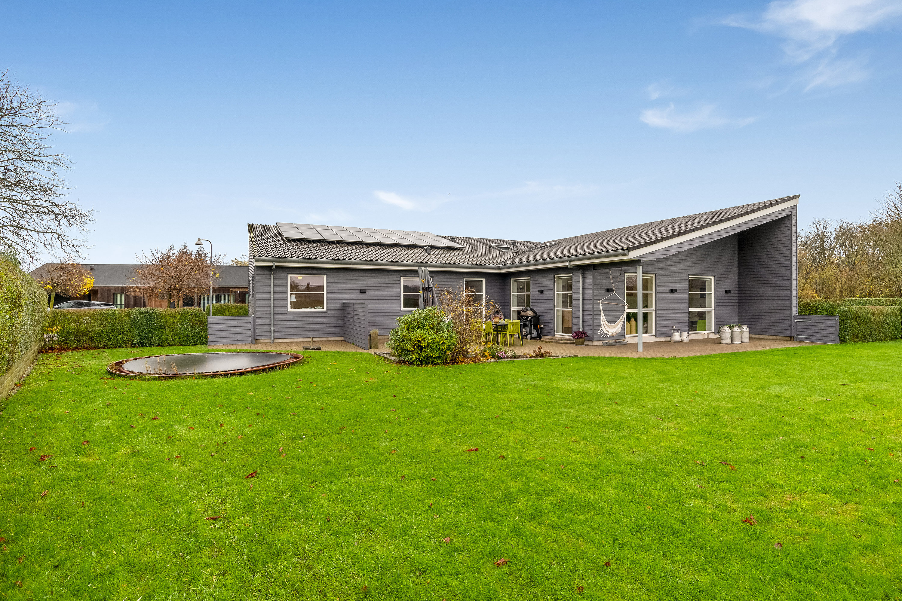 Fra første øjeblik mødes I af en i 2025 malet og indbydende facade med store vinduespartier, der lukker lyset ind og skaber en varm atmosfære.