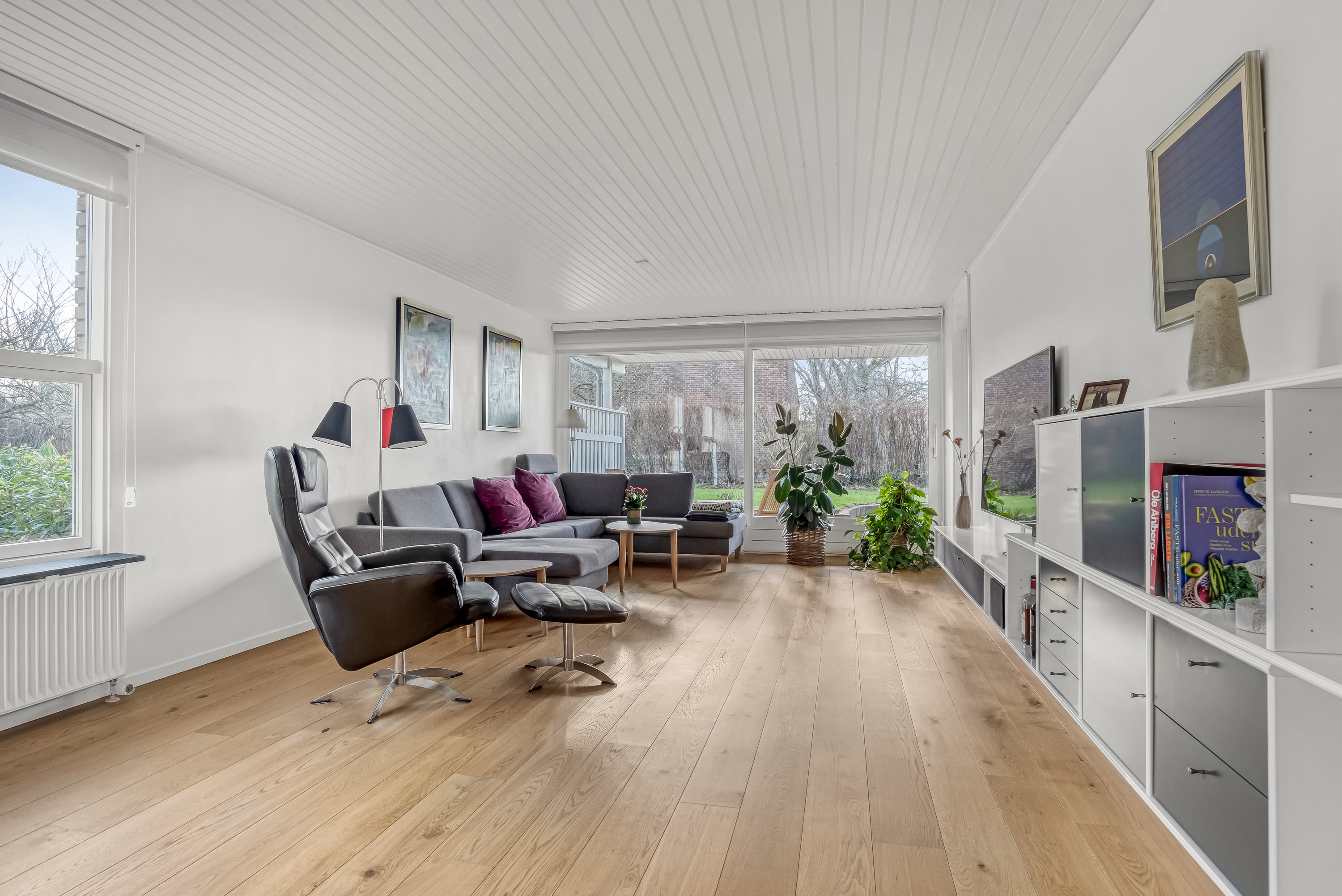 Boligarealet er på i alt 136 m2 og rummer en præsentabel entré med adgang til det lyse og moderne køkken/alrum. Et velfungerende bryggers i forlængelse med udgang til en stor skøn morgenterrasse som er delvis overdækket. 2 værelser, heraf det ene meget stort og som ved behov nemt kan deles i 2. Her er der en skabsvæg med masser af dejlig opbevaringsplads og desuden udgang til haven. Stor opholdsstue med plads til både sofaarrangement og langbordet når gæster kommer på besøg, ligesom udgang til delvis overdækket sydterrasse. Soveværelse hvorfra der er direkte adgang til opdelt toilet med håndvask og bruserum – dog praktisk med toilet i hvert rum.