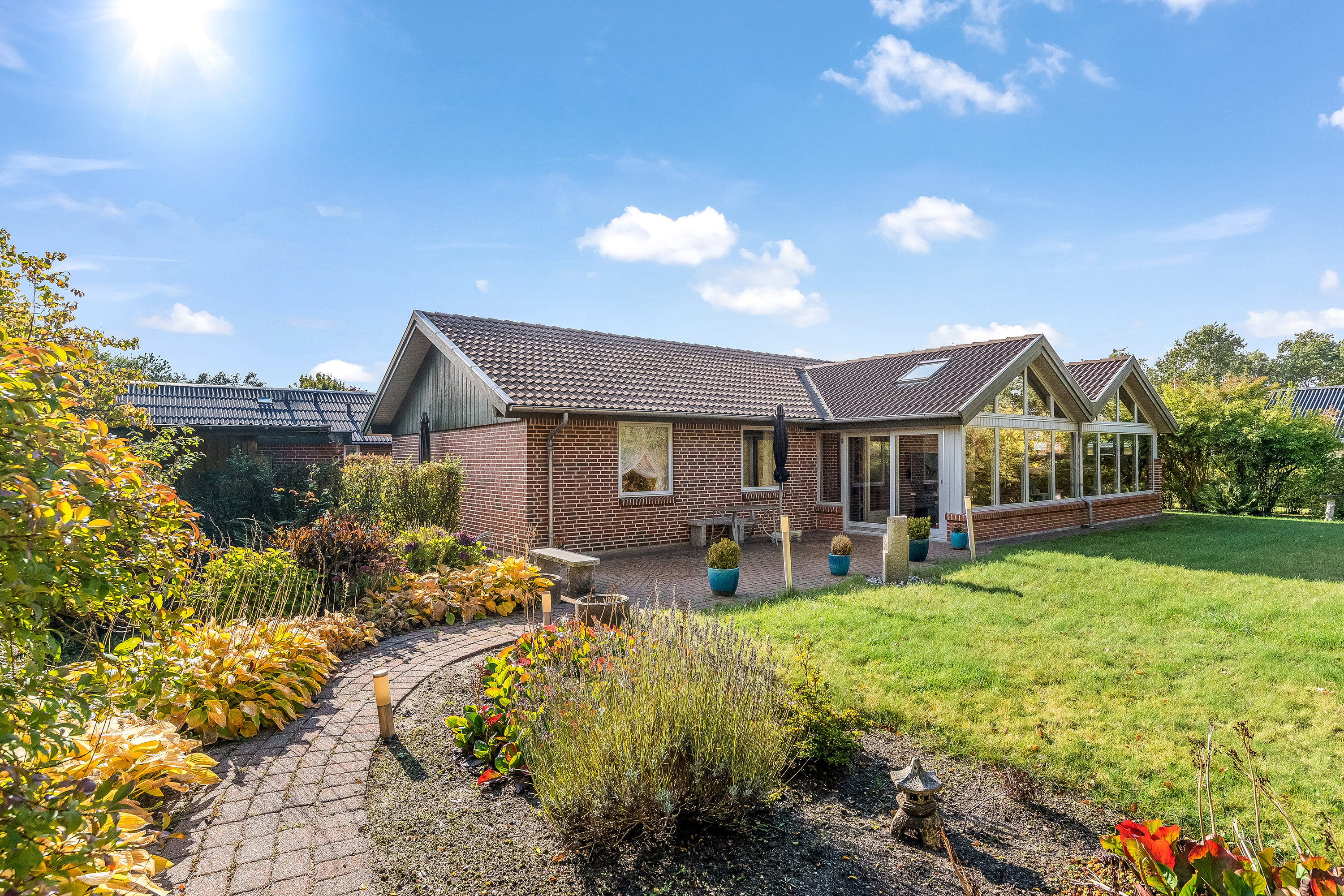 Ejendommen ligger på en 920 m² grund, hvor du får både solrige terrasser, en hyggelig have med plæne og bede samt en lang flisebelagt indkørsel. Til huset hører carport, værksted, skur og redskabsrum, som giver gode muligheder for hobby og opbevaring.