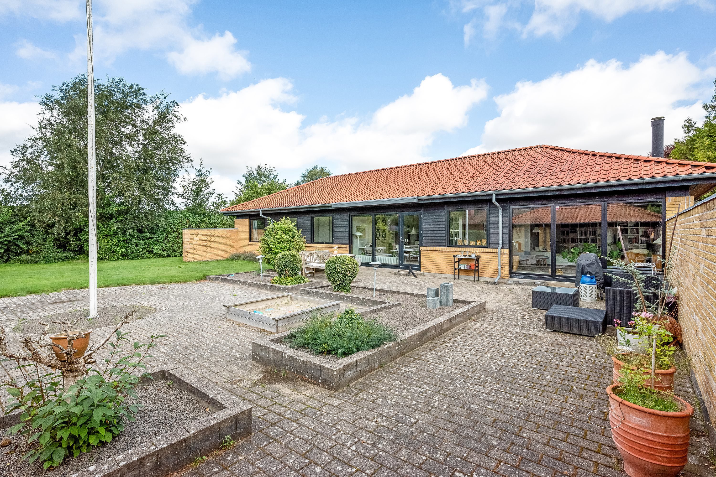 bruseniche og badekar. Kvalitetsstofpersienner i sort – tilpasset vinduerne – kan medfølge. Huset fremstår generelt i indflytningsklar stand. Den murede garage har automatisk port og el-ladestik, og facaden er arkitektonisk sammenhængende med selve boligen. Indkørslen er rummelig og praktisk. Fra både alrum og opholdsstue er der direkte udgang til en stor terrasse med plads til både lounge og spiseområde. Terrassen er udstyret med en elektronisk markise med integreret lys, og en muret væg mellem hus og garage sikrer privatliv og en harmonisk helhed mellem hus og uderum. Terrassen er fuldstændig ugeneret uden indkig fra vejen. Haven er plan med nedgravet trampolin og god plads til leg. Et hjem med sjæl, lys og kvalitet – til familien, der ikke går på kompromis med æstetik funktionalitet og komfort