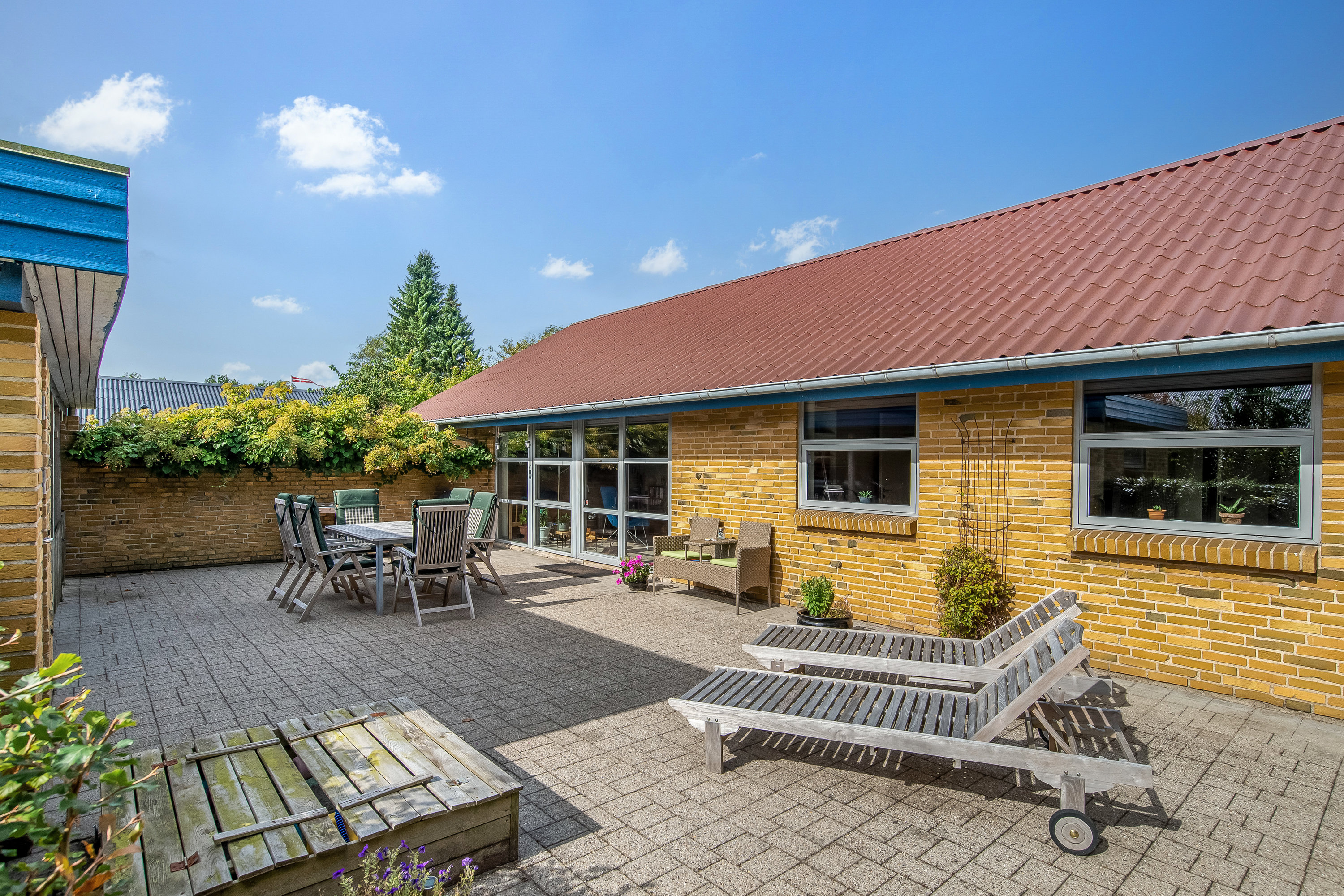 I bryggerset er der plads til vaskemaskine og tørretumbler, og entréen med indbyggede skabe sørger for orden ved daglig af- og påklædning. Et velplaceret badeværelse og gæstetoilet fuldender planløsningen. Særligt skal den store, solrige terrasse fremhæves. De brede glaspartier fra stuen åbner direkte ud til det flisebelagte uderum, som er privat og omgivet af frodig hæk — perfekt til grill, leg og lange sommeraftener.
