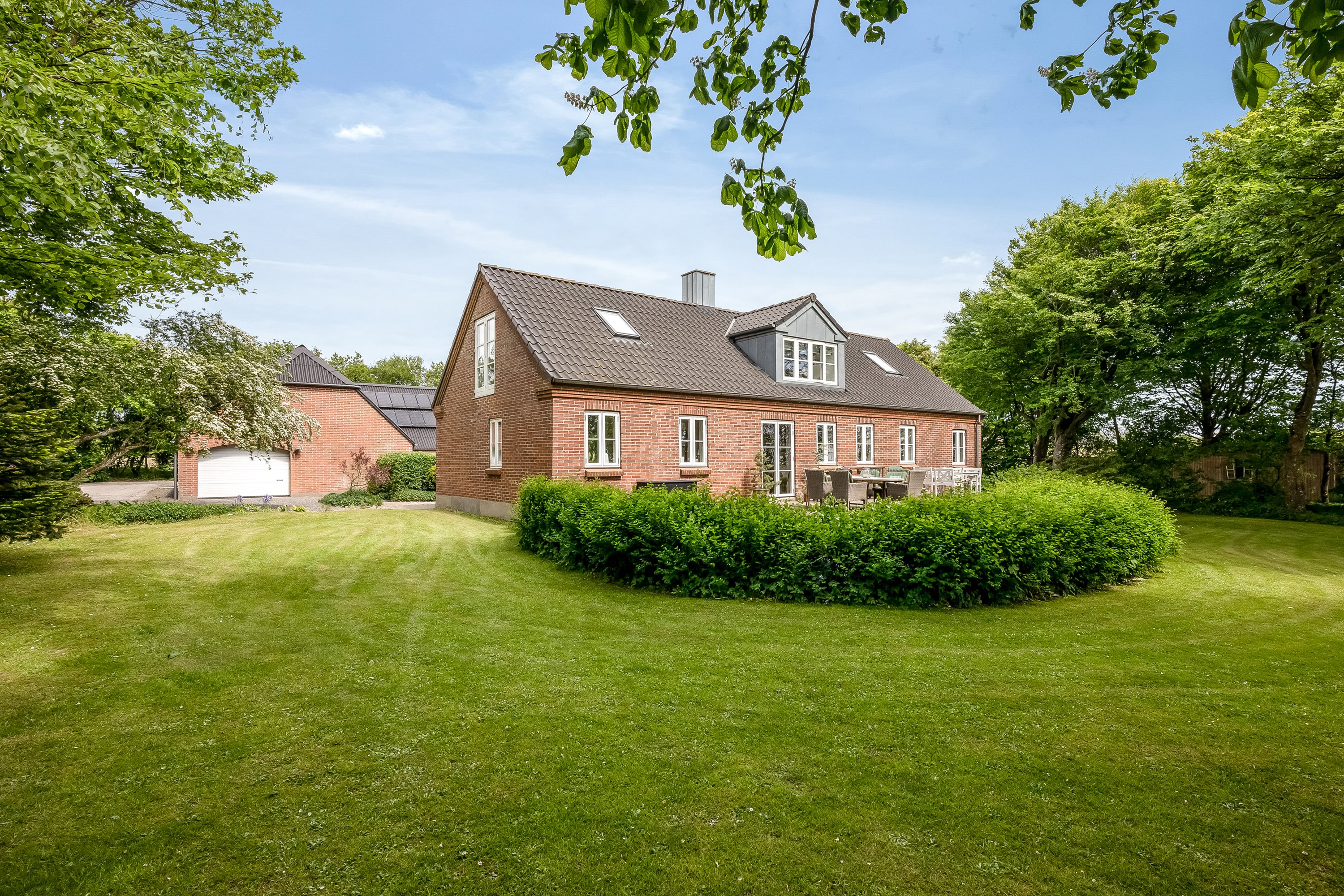 Det åbne opholdsområde er ideelt til samvær, hvor store vinduer sikrer pragtfuldt lys og en dejlig udsigt til den store have med egen sø. Her kan man nyde solen, slappe af med en bog eller invitere til middag med udsigt til naturen.