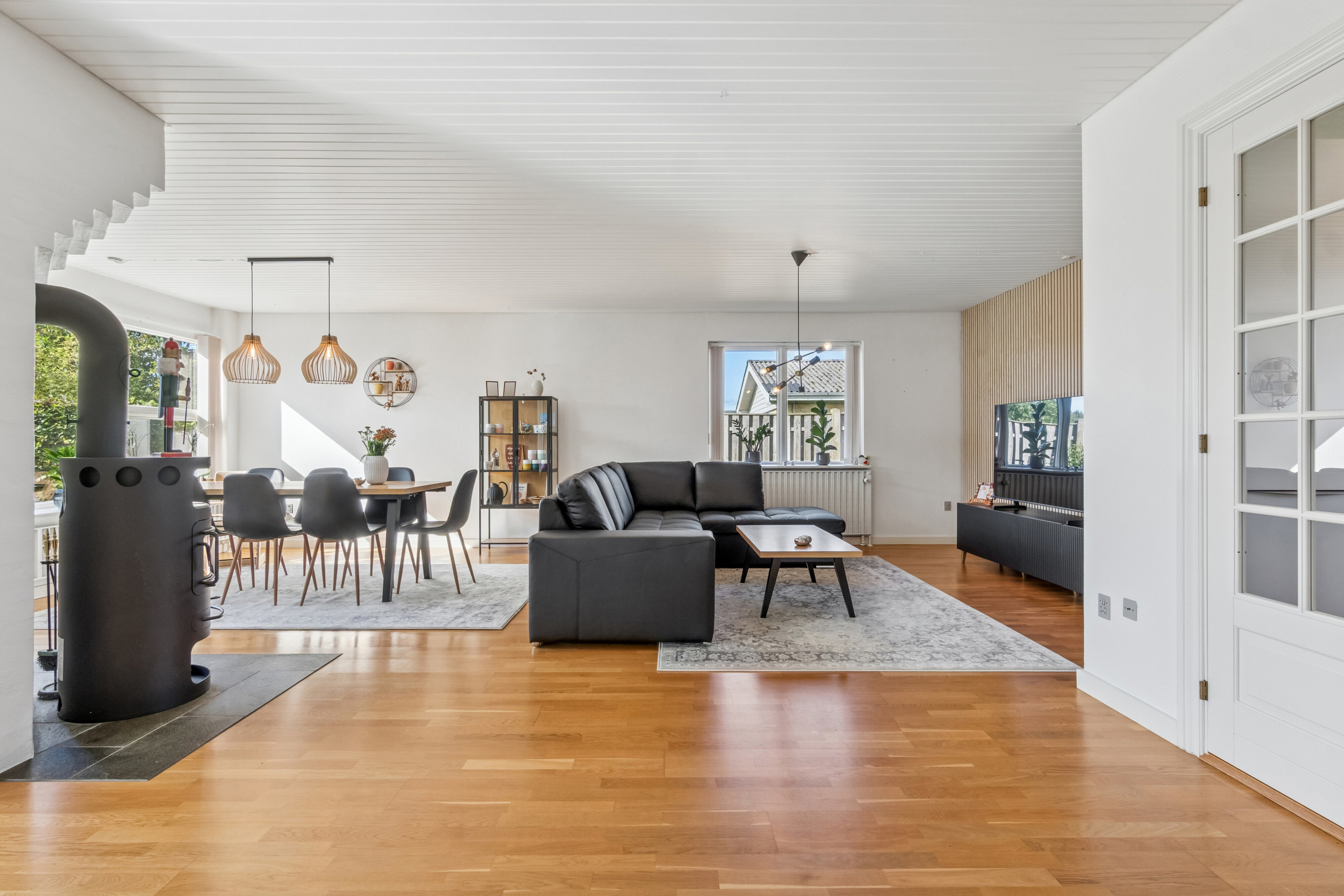 Boligen fremstår lys med store vinduespartier mod haven, og førstehåndsindtrykket er et indbydende hjem med gode opholdsflader. Planløsningen rummer i alt 4 værelser, samt et stort opholdsrum med spise- og tv-område.