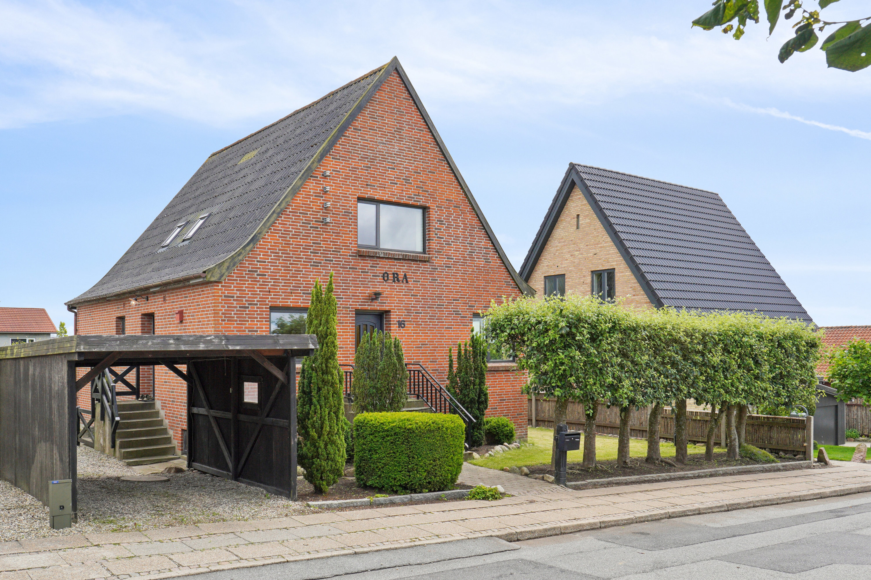 Boligen fremstår udvendigt med en facademur i rød-brune sten og nye træ-alu vinduer fra 2023. Beliggende på en nem og overskuelig grund med græsplæne og en stor hævet træterasse med direkte udgang fra stueplan.