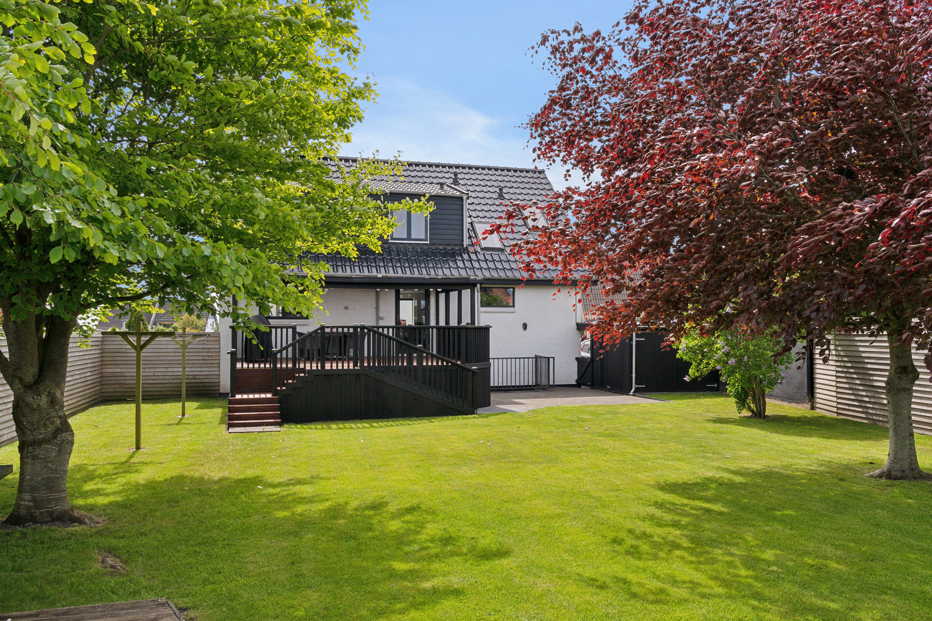 flisebelagte arealer samt en skøn overdækket træterrasse ved huset.