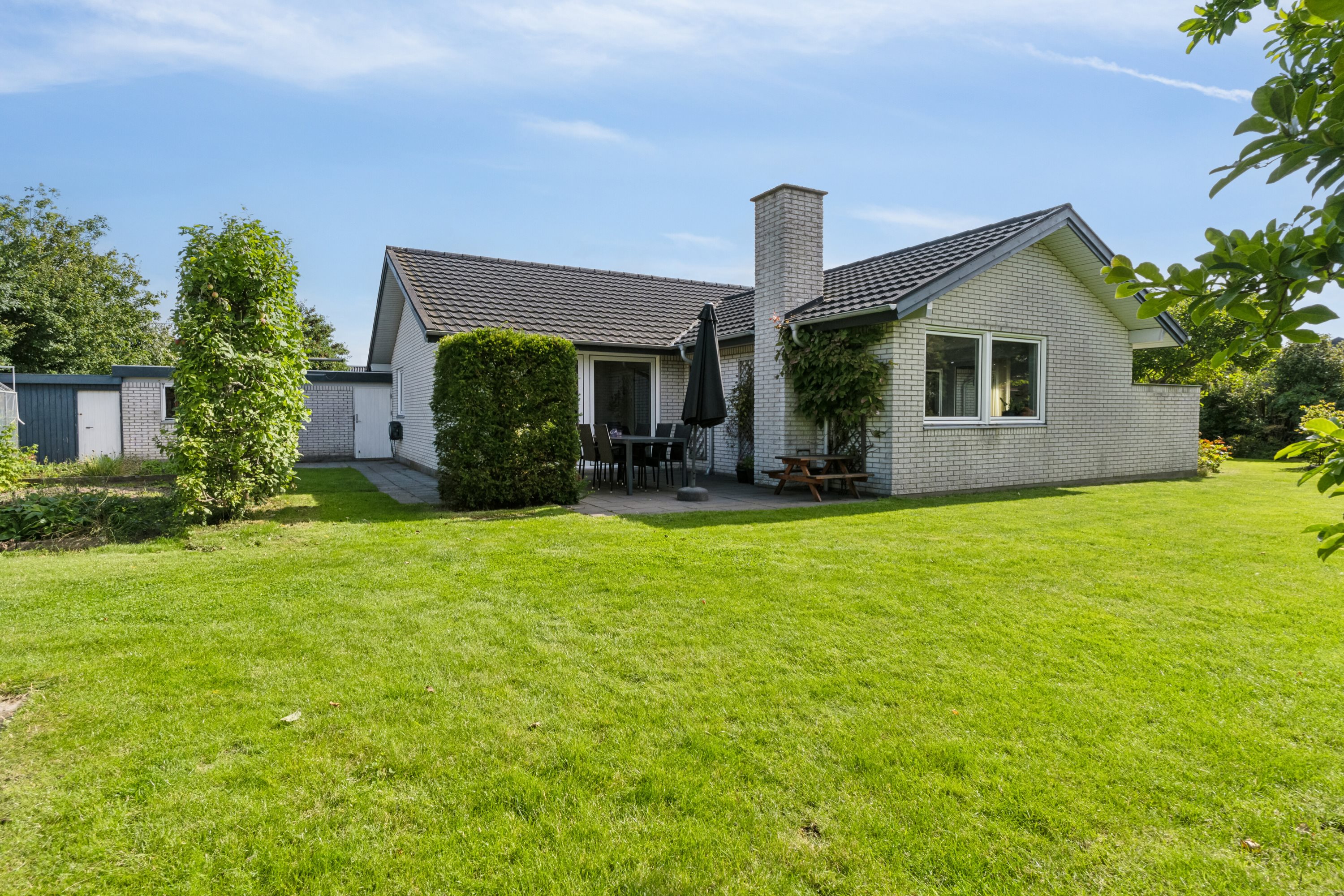 Huset her er opført i hvide kalksandsten og rummer over 186 bolig kvadratmeter i et plan, som består af: Bryggers/Entré med mørke klinker, bordarrangement og plads til vaskemaskine og tørretumbler. Rummeligt køkken i lyst elementer og med spiseplads. Fin spisestue med udgang til syd-/vestvendt flisebelagt terrasse. Rummelig daglig stue med udgang til syd-/østvendt flisebelagt terrasse. Her er der både plads til stort sofaarrangement samt legehjørne til de mindste. Fordelingsgang. "Pæn entré". Gæstetoilet med lyse klinker i gulv og pæne røde/lilla klinker på væggen. Badeværelse med lyse klinker i gulv og brun/gul klinker på væggen, endvidere 2 håndvaske, masser af bordplads, badekar, bide, bruseniche og sauna (som idag benyttes til opbevaring). Kontor/værelse. Børneværelse. Soveværelse med faste skabe. Værelse.
