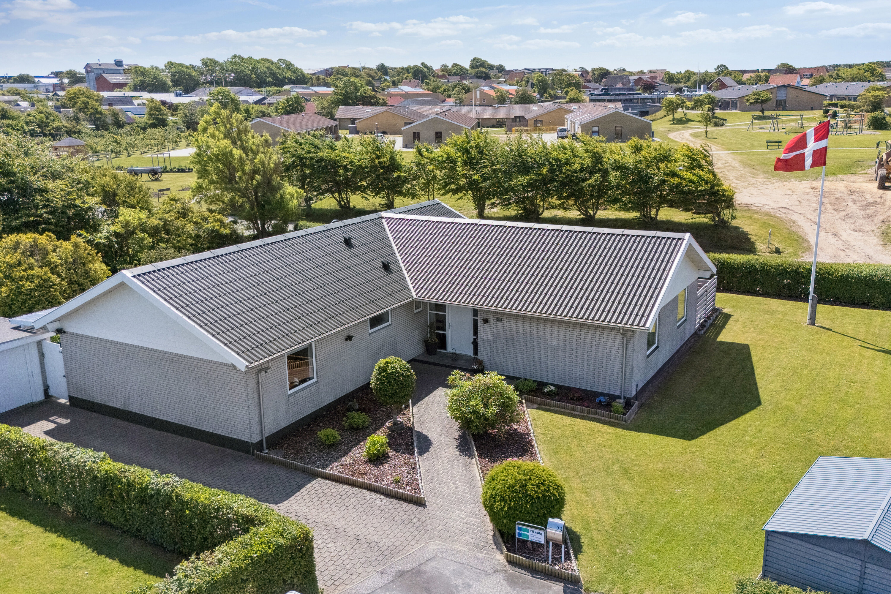 Udover huset er her en garage med hobbyrum i enden af, samt endvidere et fritliggende skur.