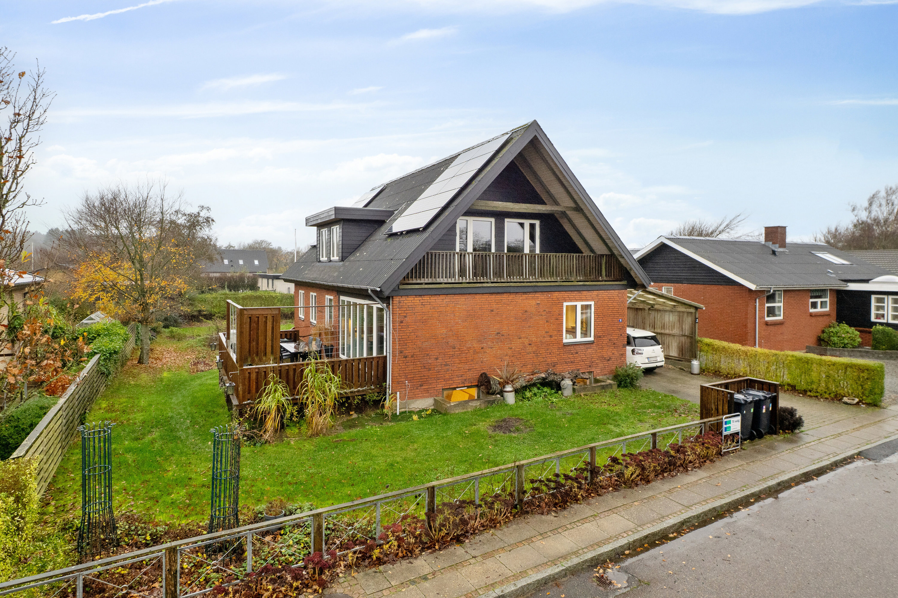 Boligen er beliggende på en 799 m² stor grund og er beliggende i et roligt kvarter. Udearealerne inkluderer en stor terrasse med sol fra sydvest, ideel til udeliv og måltider i det fri. Haven er velegnet til både leg og afslapning og byder på privathed i grønne omgivelser. Her er desuden en rummelig carport, der giver bekvem parkering og læ for bilen.