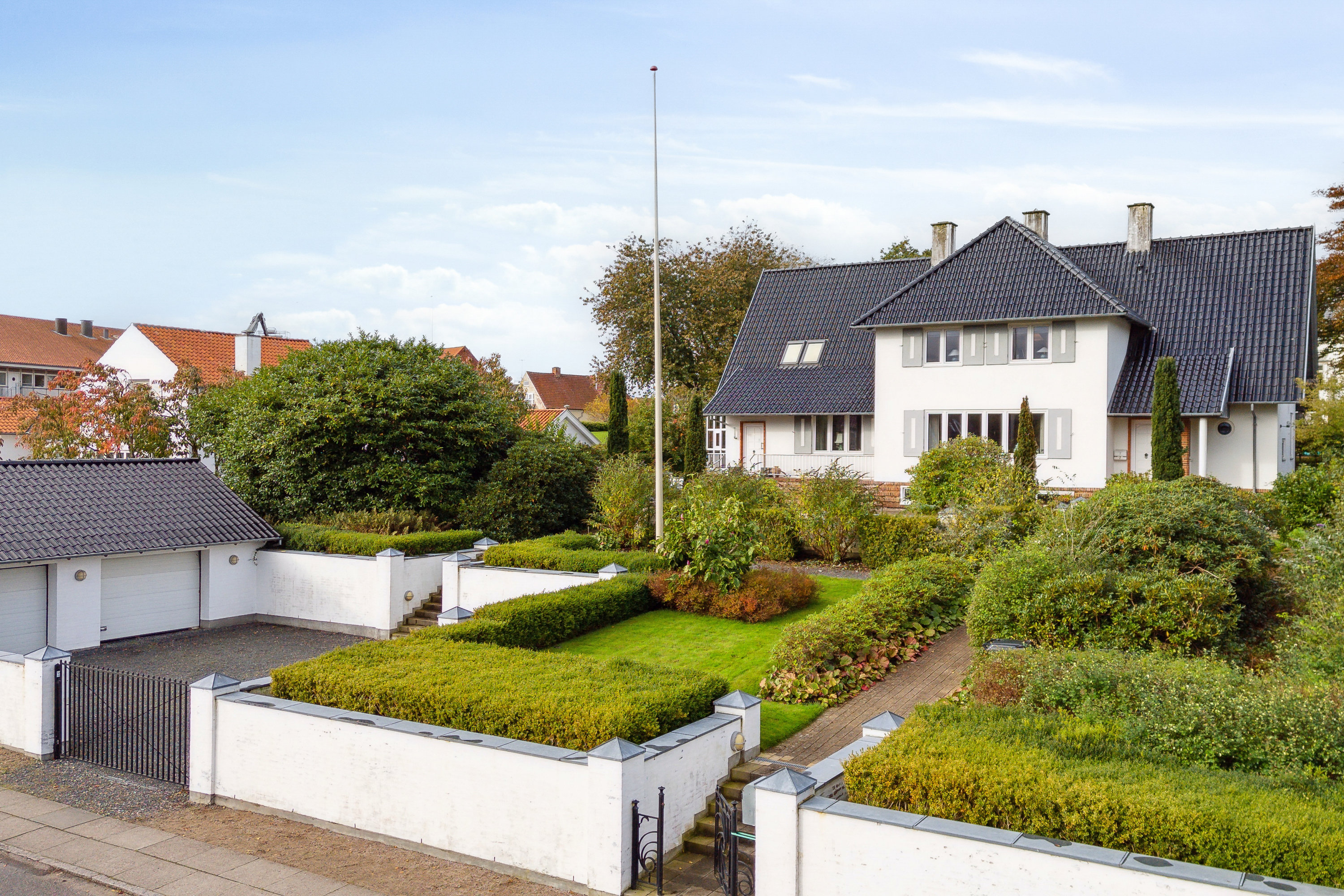 Boligens tre etager byder tilsammen på tre badeværelser og to gæstetoiletter, og kælderen rummer med sine 127 kvm et væld af anvendelsesmuligheder. Det samme gælder dobbeltgaragen, der hører til ejendommen. Udenfor indhylles villaen i et tæppe af grønt, der står rigtig godt til den lyse murstensfacade og det mørke, glaserede tegltag, som rager op mellem de frodige, tætte buskadser. Det pragtfulde og flot anlagte haveanlæg danner således en naturskøn og ugeneret ramme om jeres nye hjem: et skønt univers, der gemmer på skjulte kroge, de dejligste terrasser og mere endnu mellem farvestrålende blomster, buske og træer, hvor I kan koble af i jeres egen, private verden.