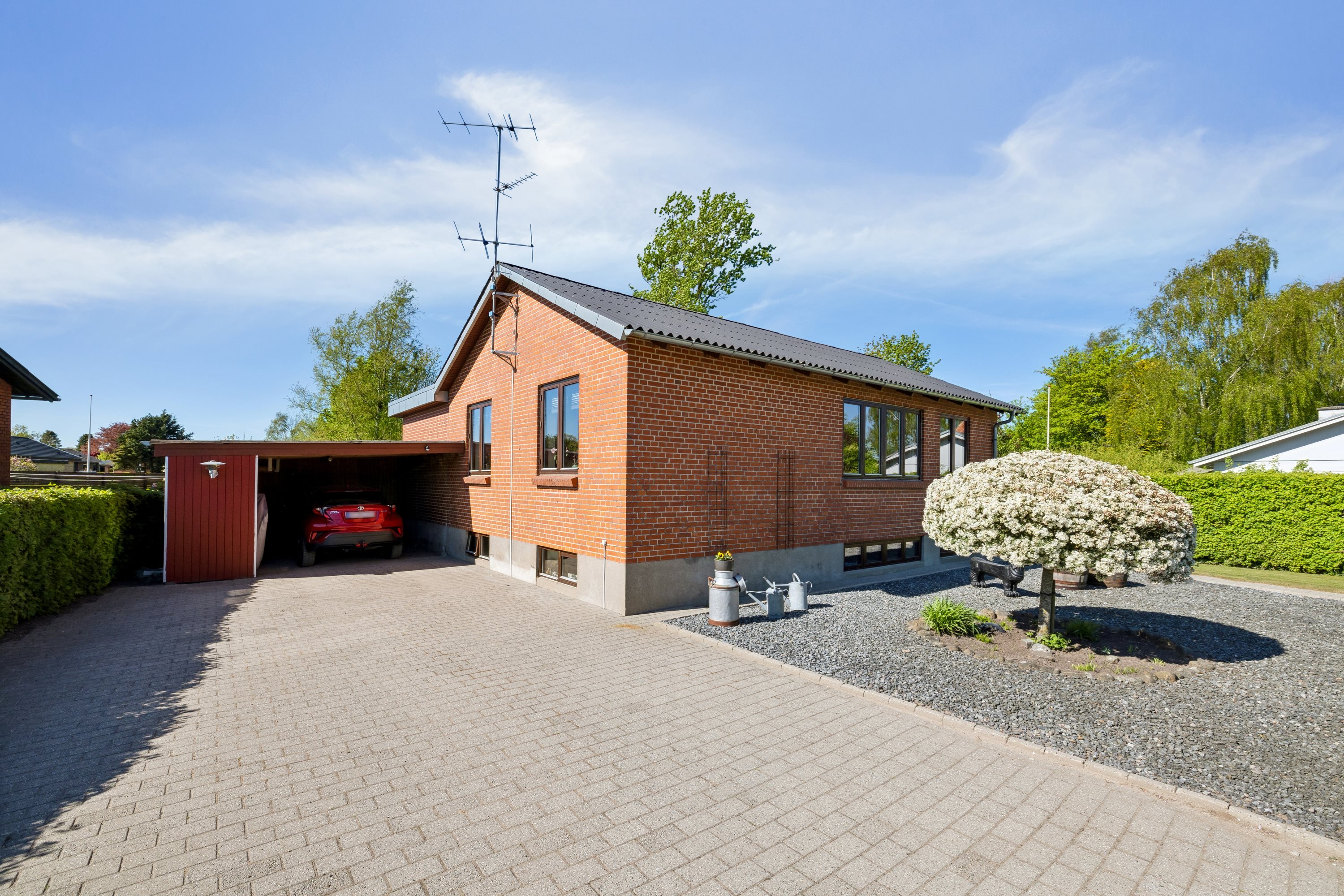 Haven er stor, men den er nem at holde, for der er gjort klar til robotplæneklipper, og i 2020 blev der lagt dræn. Ellers er det den store – og delvist overdækkede – fliseterrasse, I kommer til at bruge tid på, for her er solkroge hele dagen lang.I kommer til at bo midt i Stoholm, og indenfor 500 meter er der indkøb, bager, takeaway, læge og togstation.