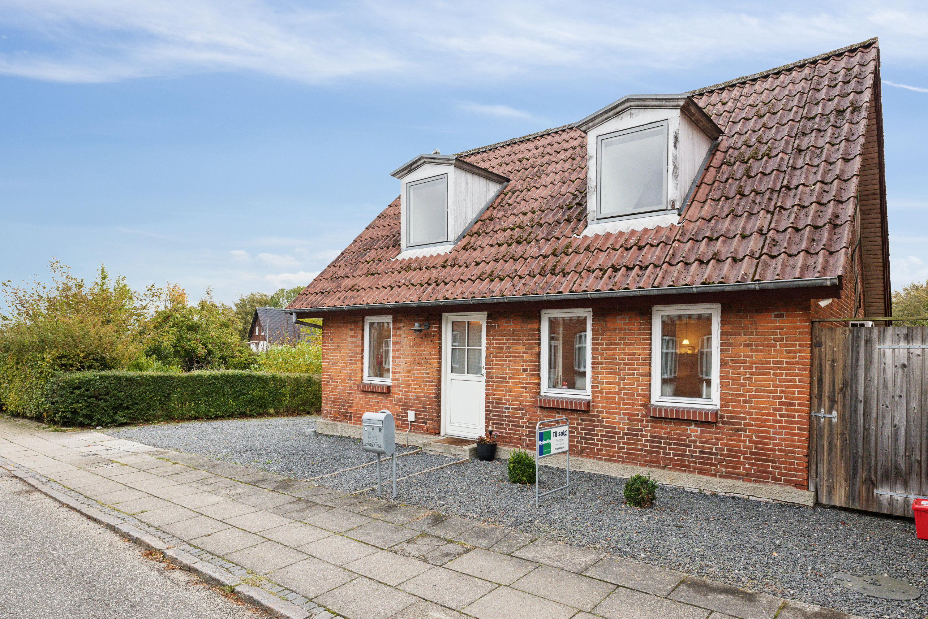 På klassisk vis pryder huset gaden med røde sten og rødt tag, og de hvidrammede vinduer fuldender det klassiske udtryk. Bilen kan trilles ind i indkørslen, og omme bagved får I en hyggelig, overskuelig og dejlig ugeneret have. Fra græsset kommer en overdækket terrasse til grillen, terrassemøblerne og sommerdagene, og her er der også udhus med fin plads til plæneklipperen og liggestolene.