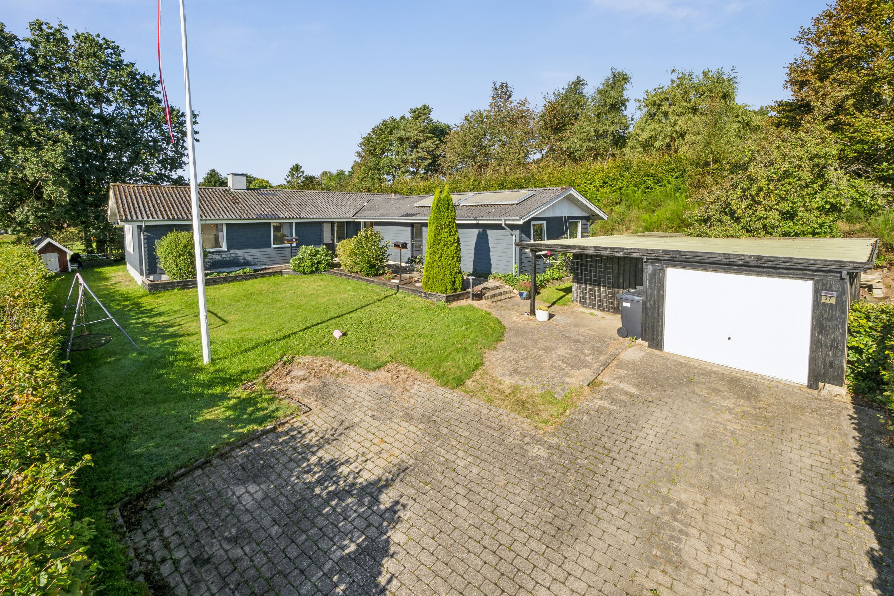 Ejendommen fra 1974 er i pæn stand, og til grunden hører der et dejligt, grønt haveanlæg med anlagte bede og frodige buske. Derudover får du flisebelagte terrasseområder med god plads til møblement, så du kan sidde og nyde udsigten til haven og den blå himmel. Slutteligt har du en bred indkørsel med plads til, at flere biler kan holde parkeret samt en rummelig garage med et tilhørende overdækket areal.