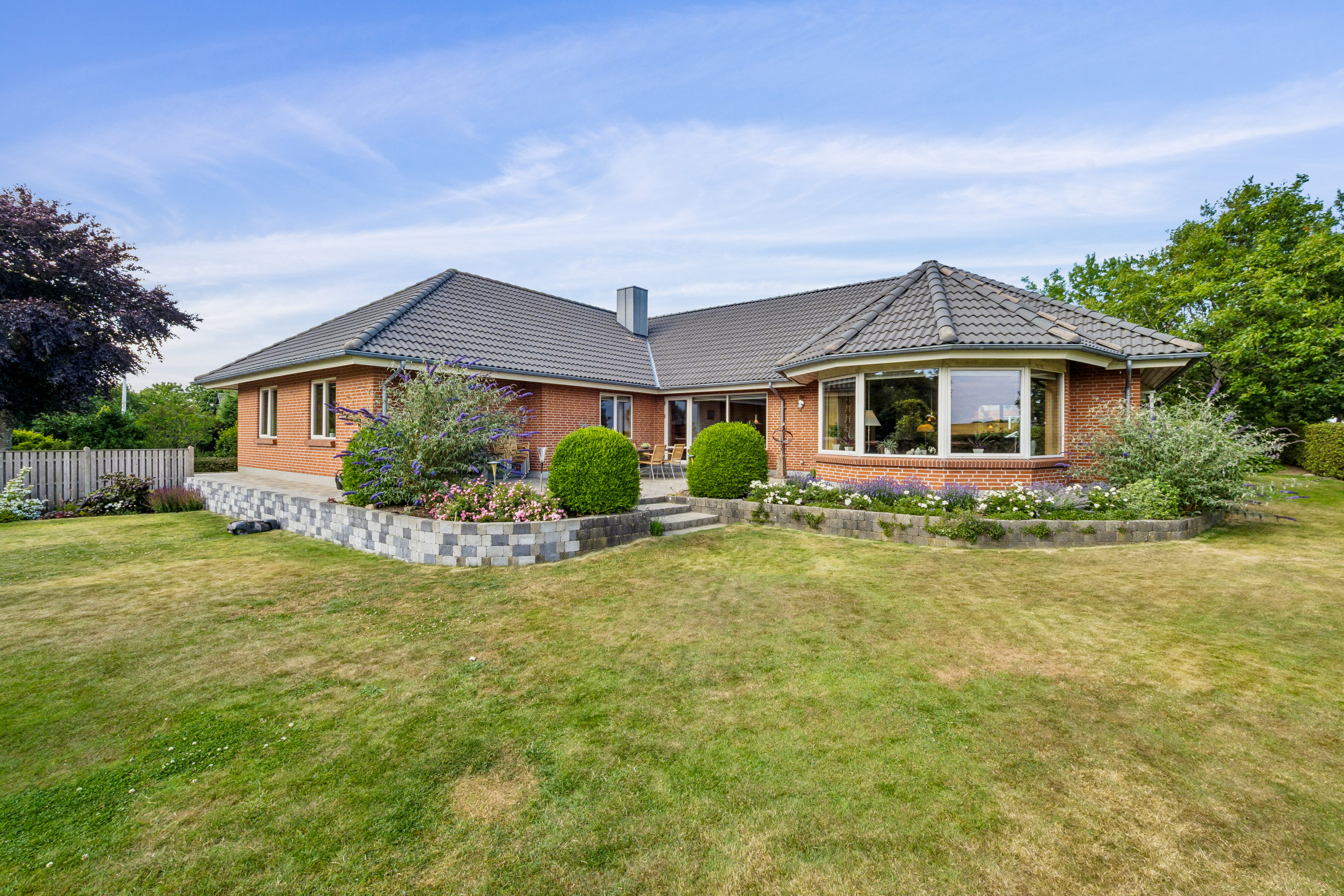 Haven er velanlagt og passer stilmæssigt til huset, der er både græsplæne, buske, små opstammede træer, stensætninger m.m..