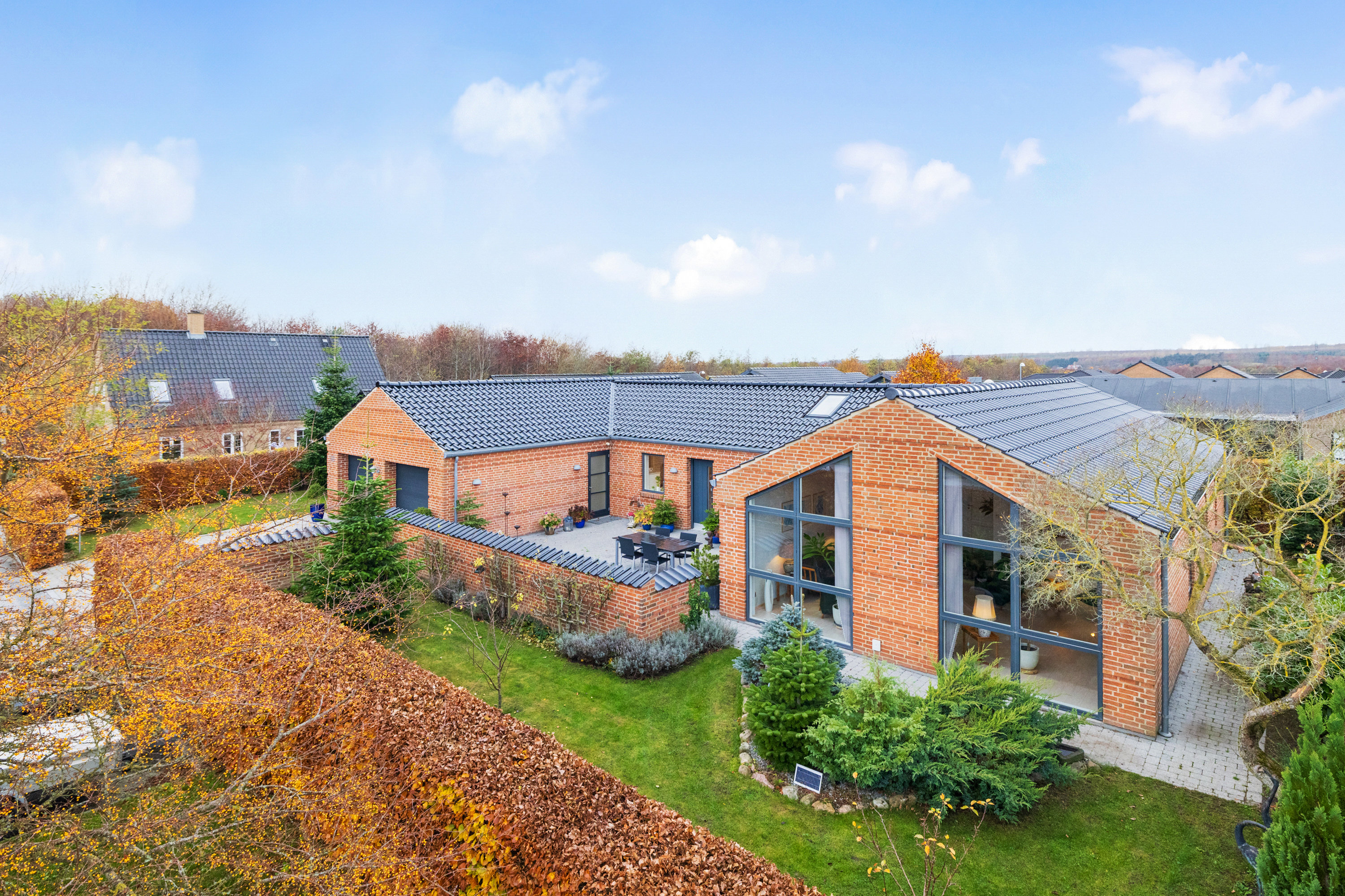 Villaen er opført i røde mursten med mørkt tegltag og store glaspartier, der giver huset et markant og elegant udtryk. Indenfor råder I over 157 m2, hvor flotte lysindfald og den tidløse stil skaber en lys og venlig atmosfære overalt.