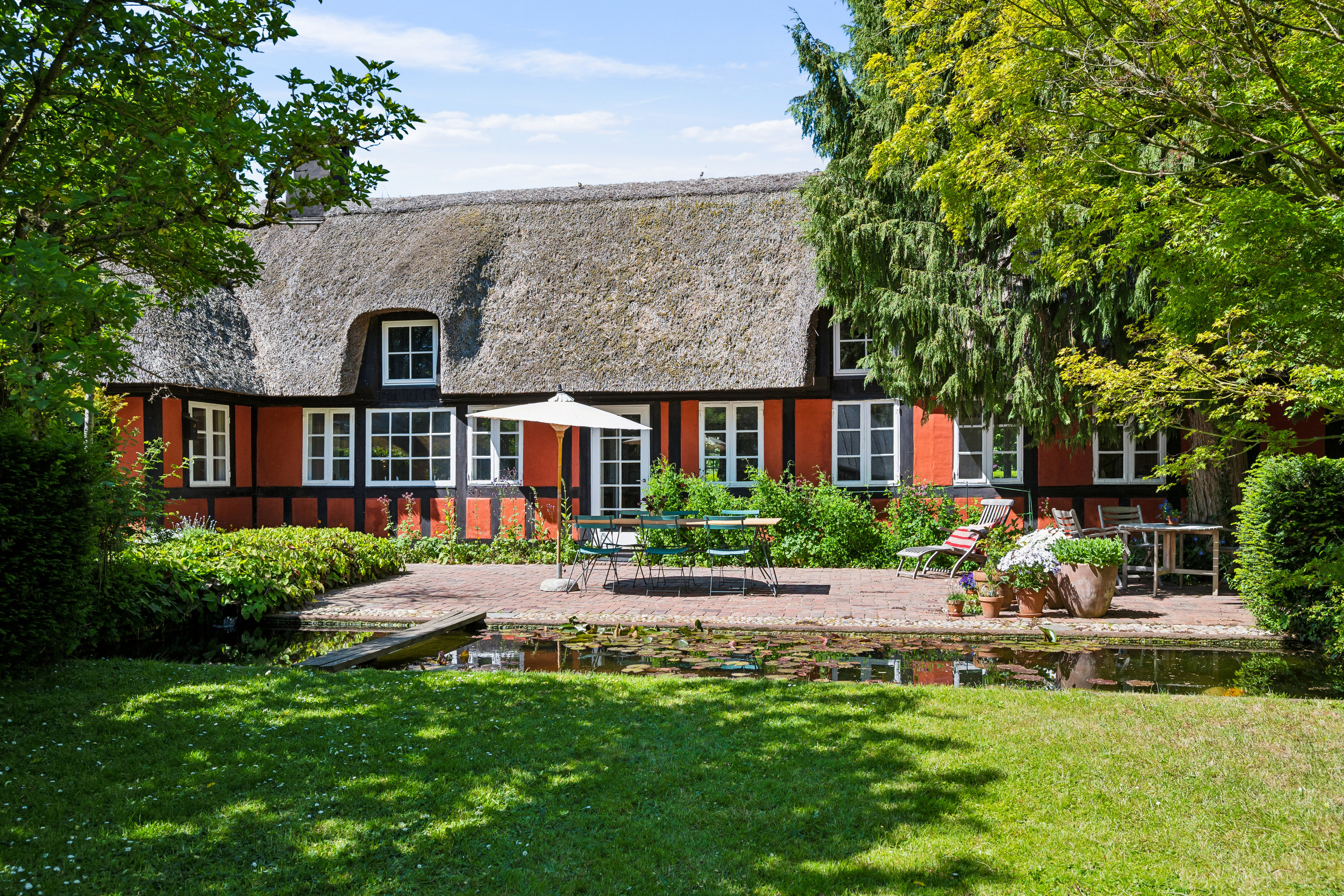 Mellem de to bygninger ligger den japanskinspirerede have, hvor terrasser i klinkebrændte tegl kombineres med grønne oaser og hyggelige kroge. Her er plads til fordybelse og afslapning omgivet af naturens rolige elementer, samtidig med at du har mulighed for privatliv.