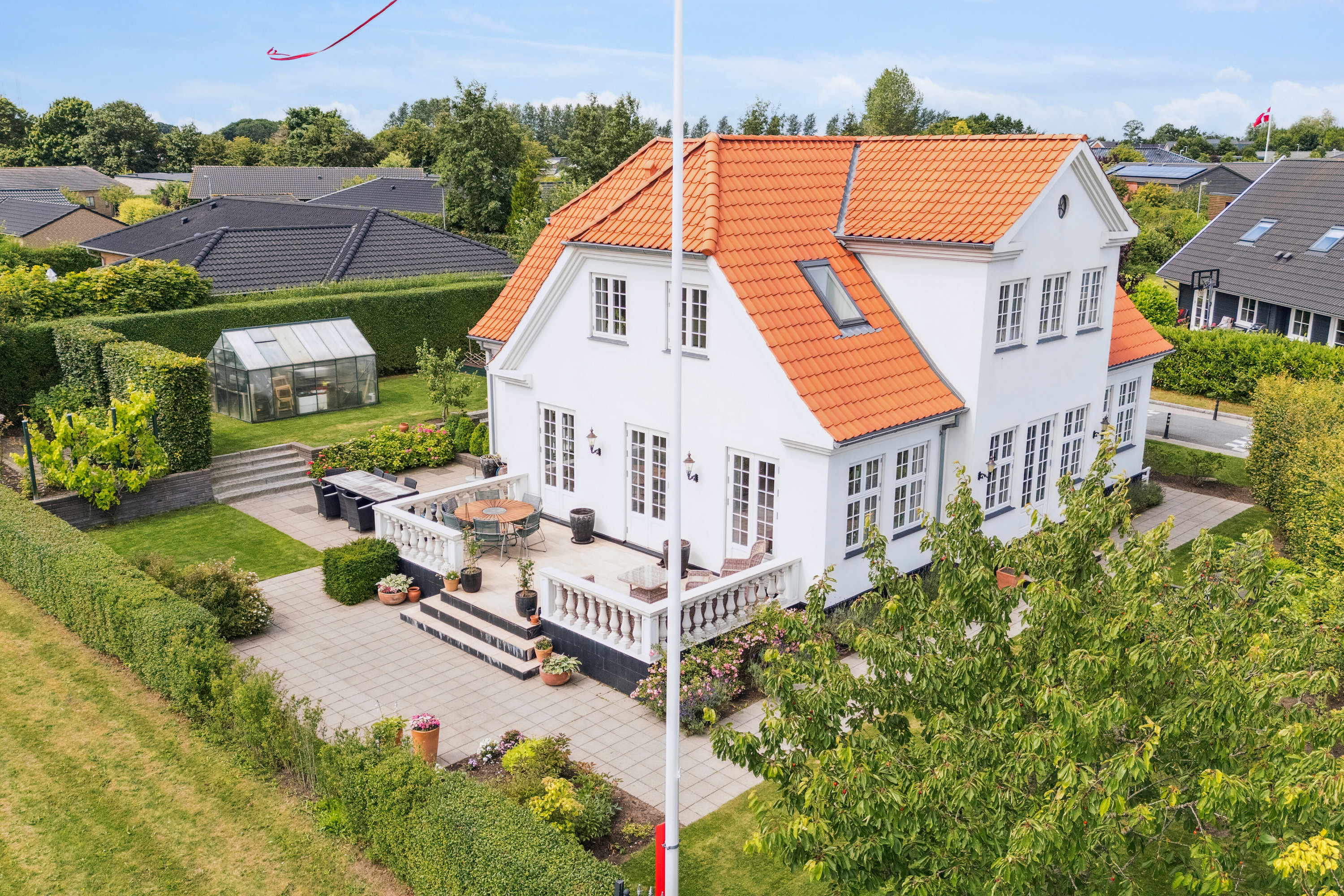 Ejendommen toner smukt frem på vejen med hvid, pudset facade, sprossede vinduer, diskrete gesimser og rødt, halvvalmet tag. Både stueplanet og førstesalen præsenterer sig lyse, indretningsvenlige og moderne med et elegant strejf af herskabelige detaljer og kvalitetsmaterialer.