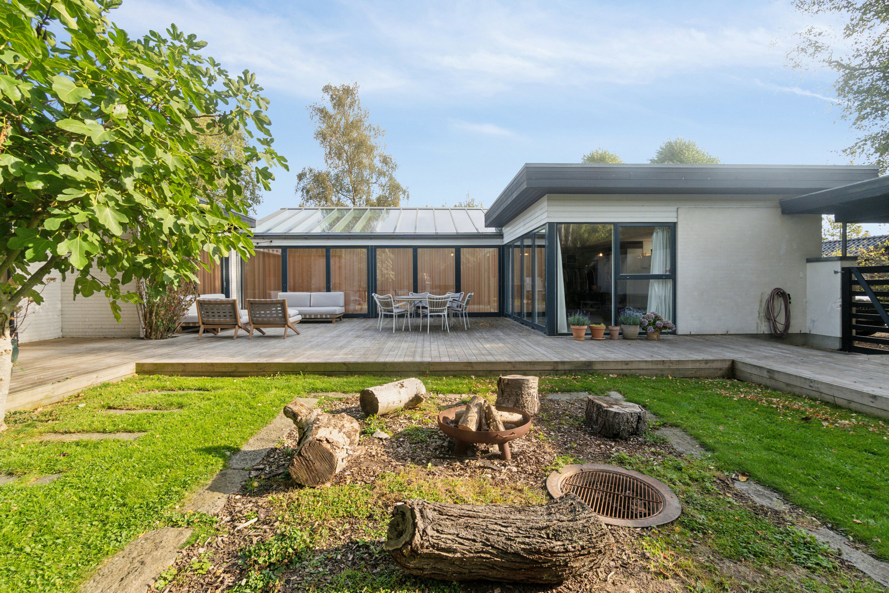 Ejendommens byggestil sender en klar hilsen til modernismen – med store vinduespartier, åbne rumforløb og flere terrassedøre, der skaber god kontakt til haven.