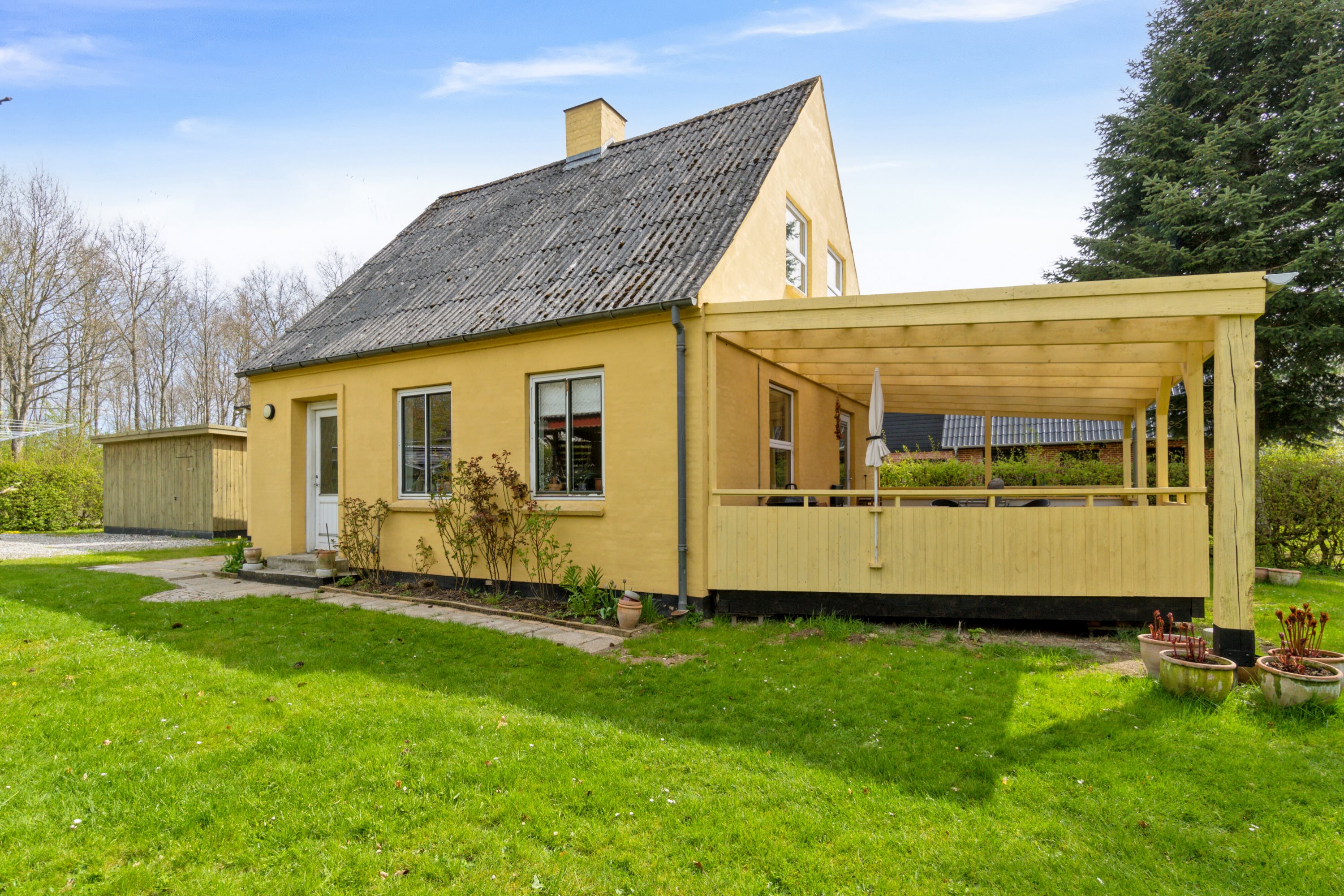 Den rummelige terrasse bliver et hit i sommerhalvåret, hvor det overdækkede areal mod syd bliver en forlængelse af boligen. Herude kan I arrangere havesættet og grillen og nyde udsynet til haven. Netop haven breder sig på en 1.096 kvm stor grund og fortsætter helt ned til et åløb, hvilket understreger den stemningsfulde beliggenhed.