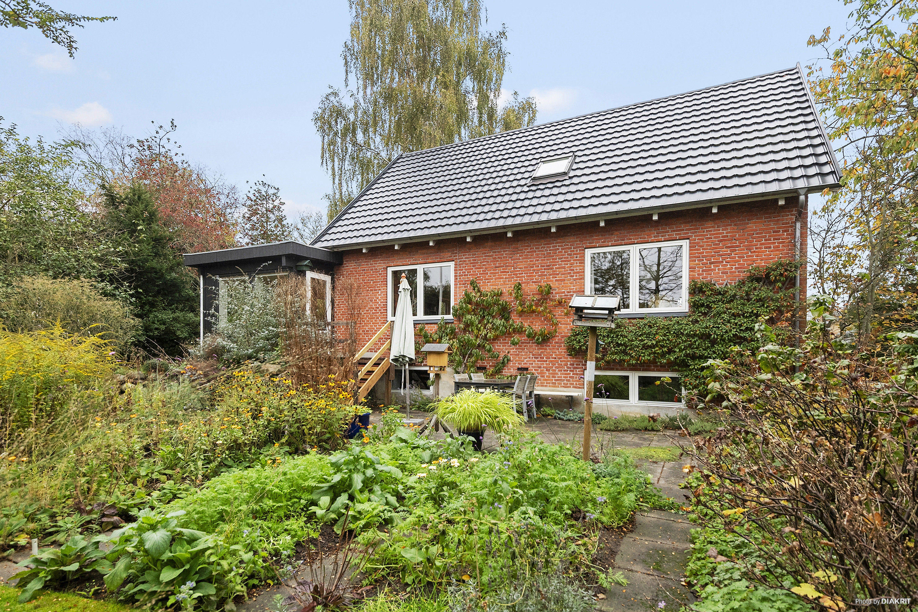 Haven, der ligger på bagsiden af huset, er nemlig sydvendt og flot opvokset, og med tre terrasser – herunder en overdækket – er der mulighed for både sol og skygge. Når bladene er sprunget ud, og haven strutter grønt, er den helt privat, ligesom her er et rigt fugleliv, der bidrager til det hyggelige udemiljø. Haven har siden 1992 været dyrket økologisk.