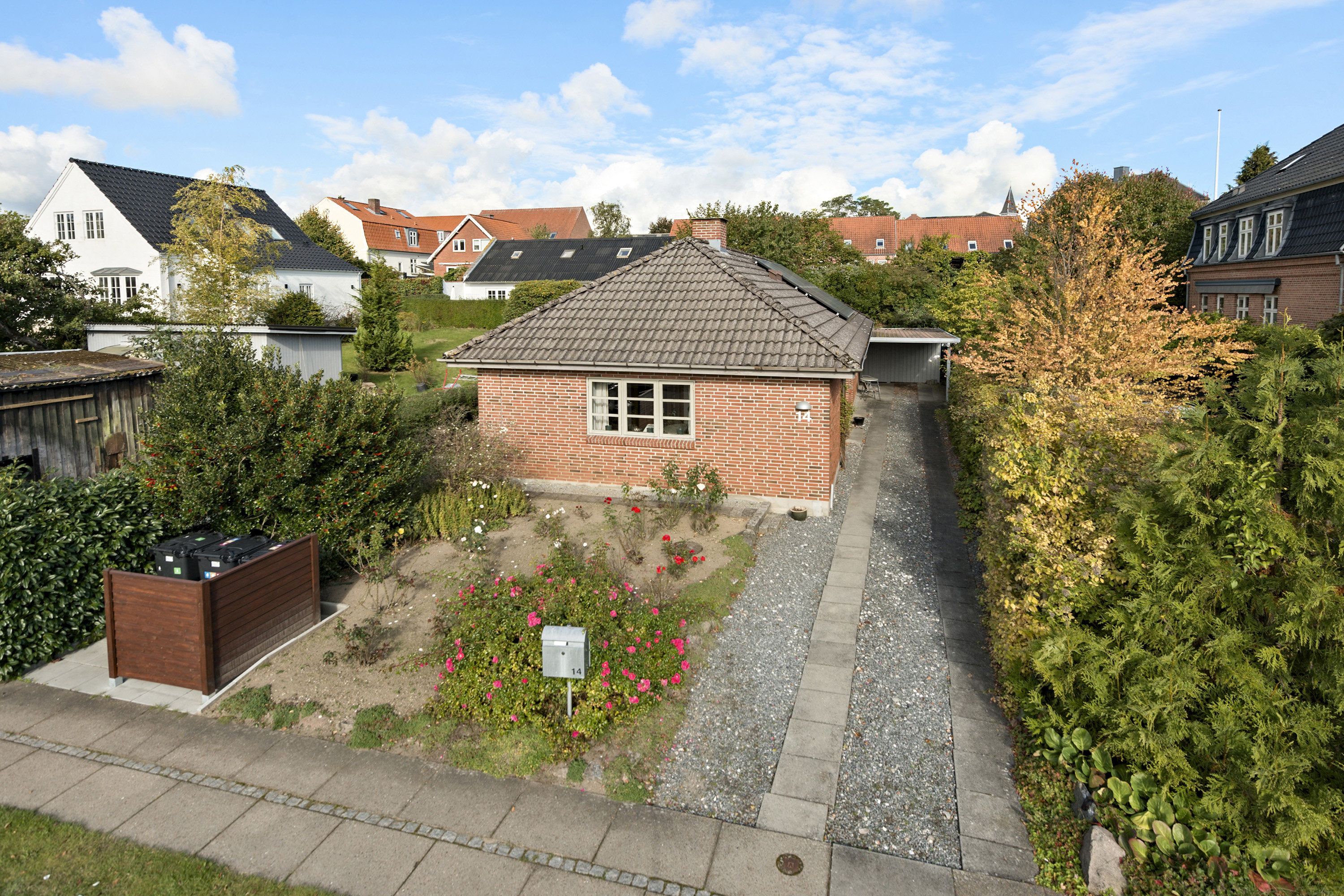 Også grunden er overskuelig med sine 386 kvadratmeter, og den er anlagt meget hyggeligt med en niveauforskel, der bagtil indrammer terrassearealet, så I får følelsen af at sidde i en lun og meget privat gryde. Terrassearealet foran køkkenet er orienteret mod vest, så I her kan sidde helt uforstyrret og badet i blid aftensol. Samtidig kan I nyde den første morgensol på det lille terrassespot på modsatte side. Bilen kan I parkere tørt i den tilhørende carport, og i redskabsskuret er der fin opbevaringsplads.