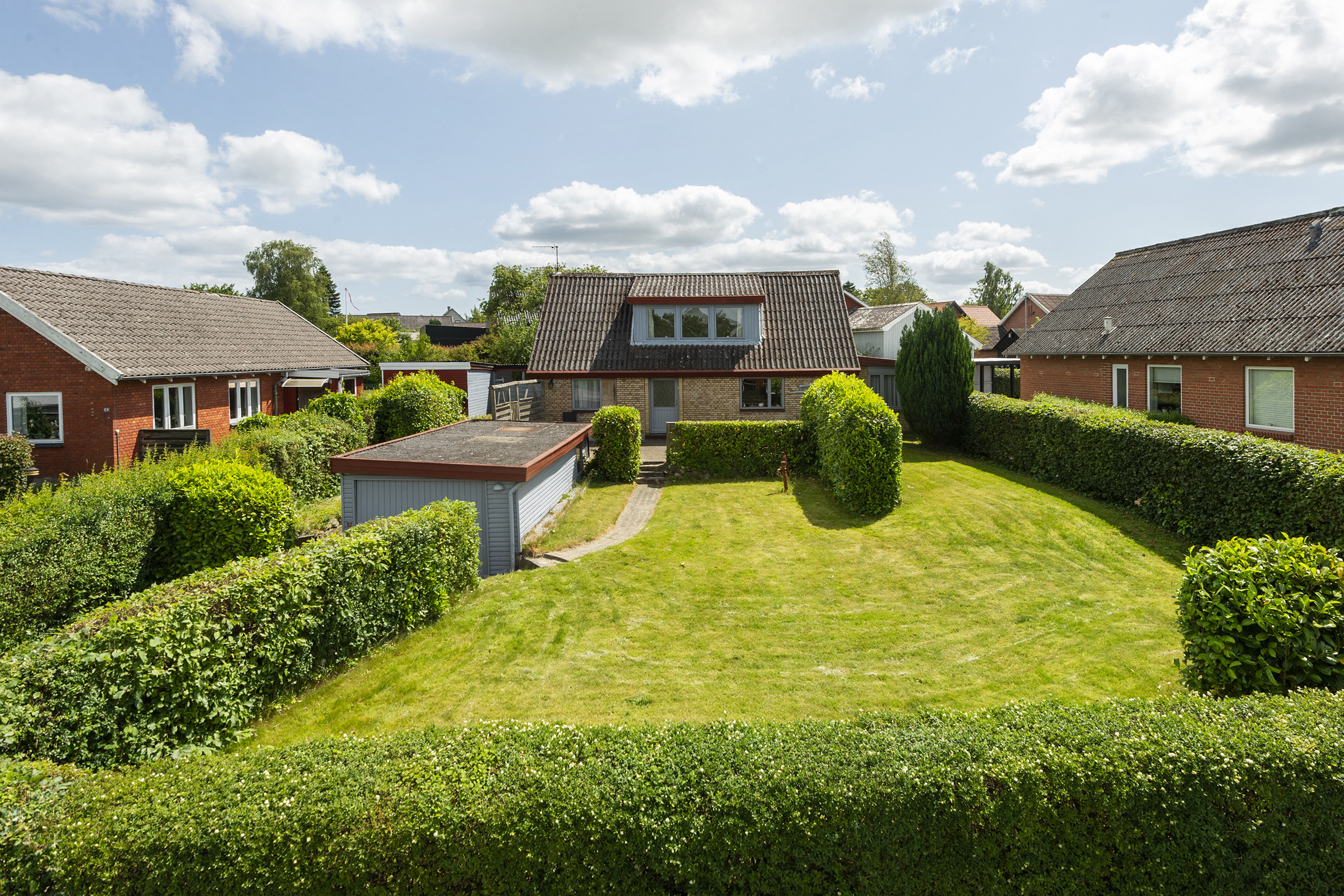Baghaven er dejligt lukket og nem at holde med græs og hæk, mens der er anlagt gode, solrige fliseterrasser omkring huset. De er alle meget private, da de er indhegnet og afskåret fra vejens trafik. Med i købet følger også en garage og et skur.