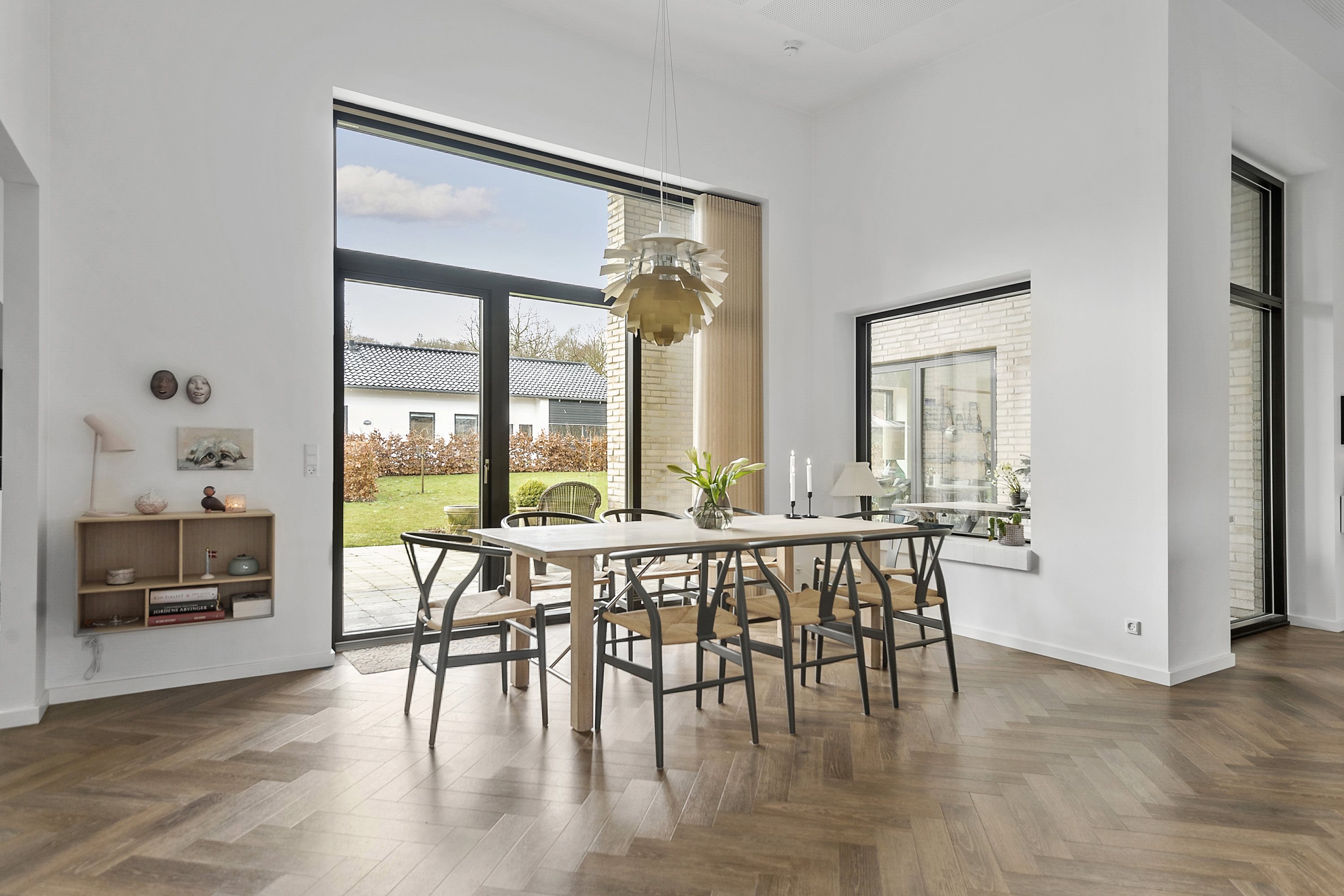 Villaen står skarpt både udvendigt og indvendigt, hvor der er tænkt meget på at skabe ro og hygge i de store, åbne rum. Flere steder er der slidstærke sildebensgulve, og både køkkenet og de to badeværelser har Vola-armaturer. Det højloftede køkkenalrum med inventar fra HTH er også værd at hæfte sig ved, for det er udstyret med viktualierum, vinkøleskab og en flot køkken-ø i mørk eg med håndvask i messing og bordplade i grønt marmor.