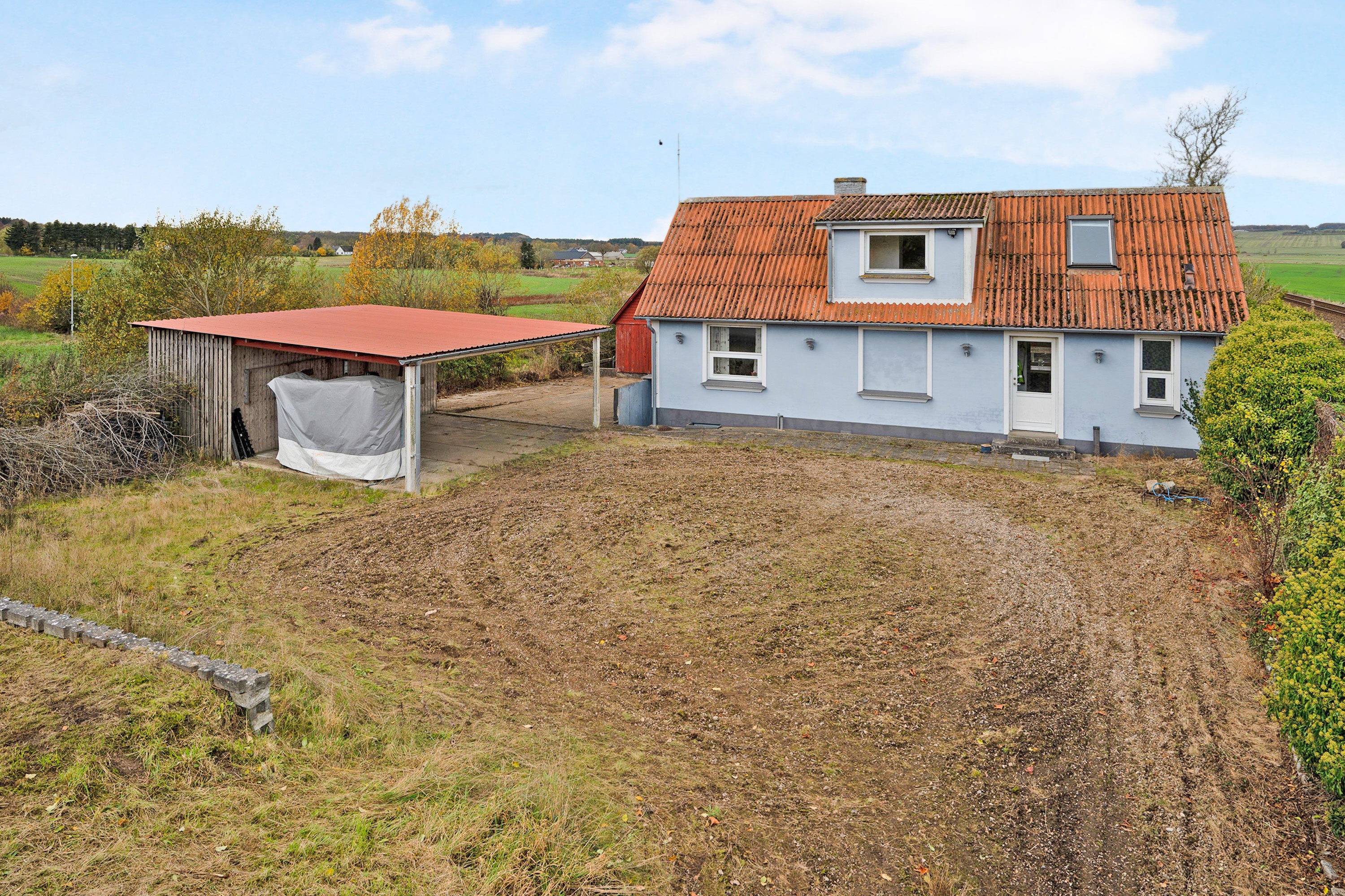For med markerne som nabo (og jernbanen), der ruller og ruller, giver den charmerende facade en følelse af forelsket forårskuller. Lyseblå facade og rødt tag, og en have der indbyder til hygge dag for dag: her kan du sidde og virkelig nyde livet, og det endda uden at tage det for givet. Det primære haveareal folder sid ud mod vest, og mens du sidder på terrassen kan du måske spotte en hest? Der er god afstand til de nærmeste naboer. Dette er et sted, hvor du for alt i verden har lyst til at blive!
