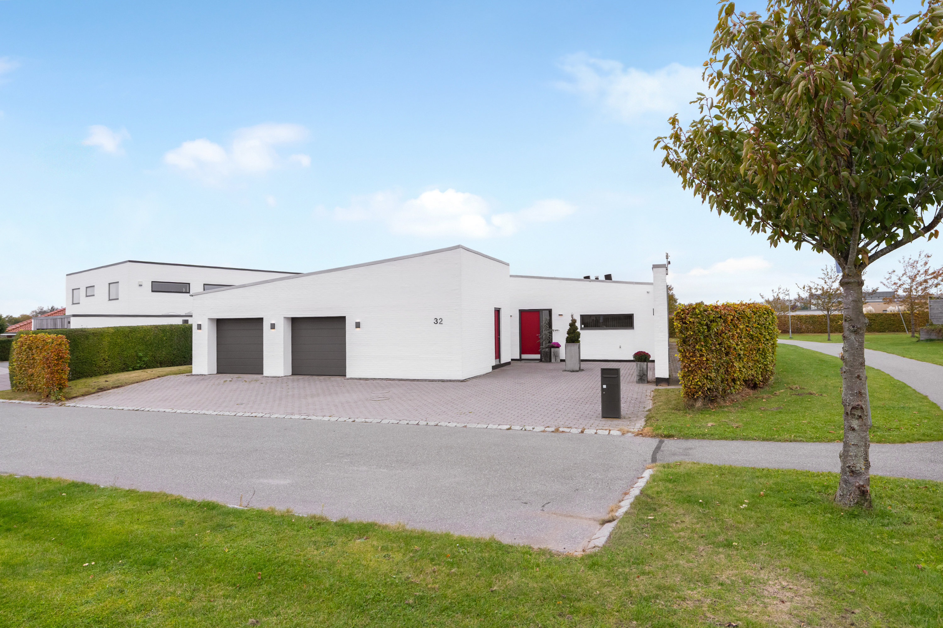 Hvis I drømmer om en gennemført, moderne villa med rene linjer, store glaspartier og en gennemtænkt indretning, vil denne ejendom fra 2010 uden tvivl tiltale jer. Her får I 212 m2 i ét plan med en lys og funktionel planløsning, dobbeltgarage og en ugeneret have.