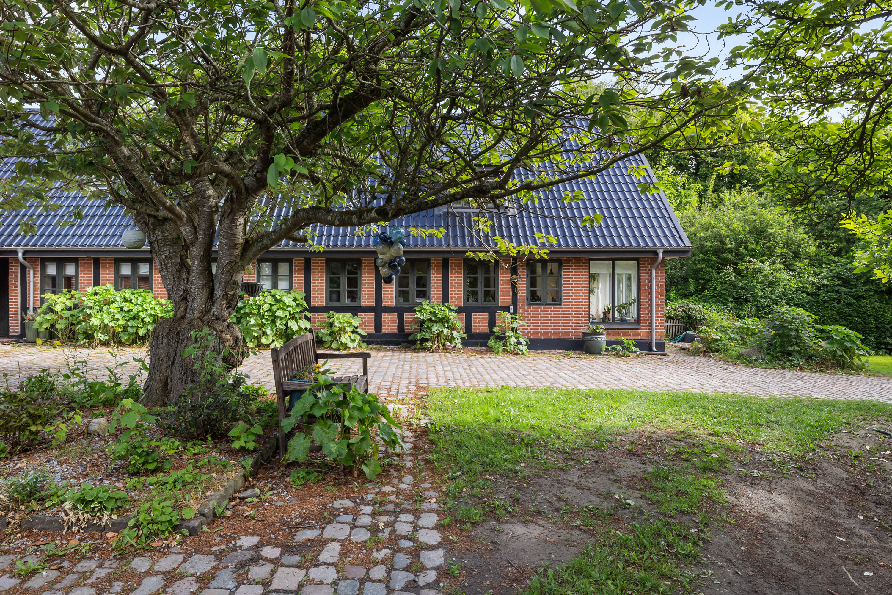 Ejendommen er opført midt i 1800-tallet, og takket være velvalgte opdateringer fremstår den både charmerende og moderne. I skyggen fra det gamle, krogede træ på gårdspladsen præsenterer hovedhuset sig flot med rød murstensfacade og sort bindingsværk, der matcher vinduesrammerne og sadeltaget. Ejendommens anden længe er udnyttet til en stor garage med værksted, og hertil kommer et par gode udhuse. Der er med andre ord god plads til hobbyprojekter, opbevaring, eller hvad I nu har brug for.