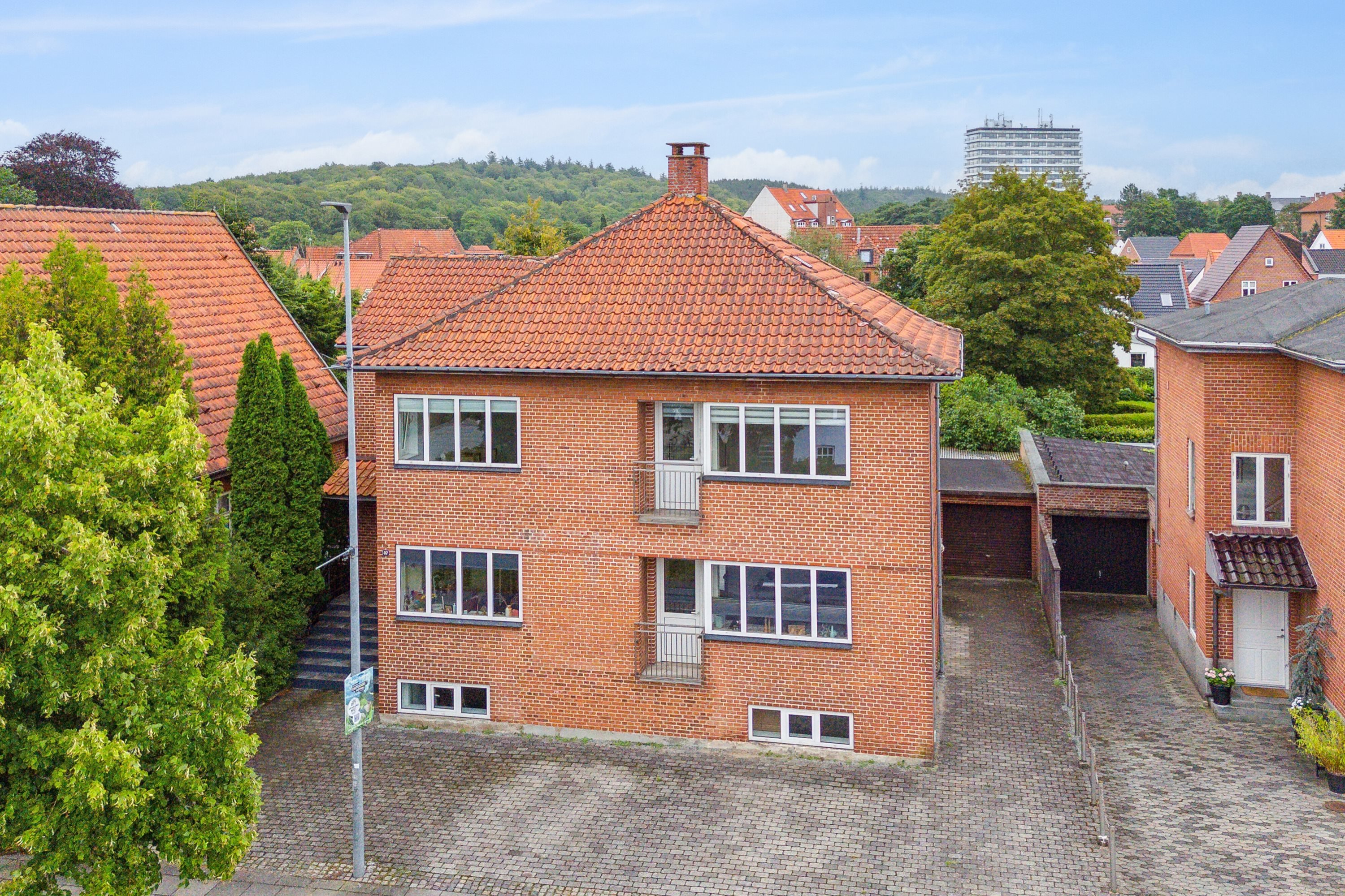 Efter bilen er parkeret og slukket, træder I ud og tager den smukke, røde ejendom i øjesyn. Charmen og karakteren fra 1934 er bestemt til stede, og formsproget med lige linjer og harmoniske vinduespartier vækker stadig genklang den dag i dag. Inden døre går I på opdagelse blandt tre velholdte etager, der starter nede i den meget anvendelige kælder med køkken, badeværelse og disponible rum. Både stueplan og førstesalen er indrettet med hver sin boligenhed, der spænder over et køkken, to stuer, et værelse og et badeværelse.