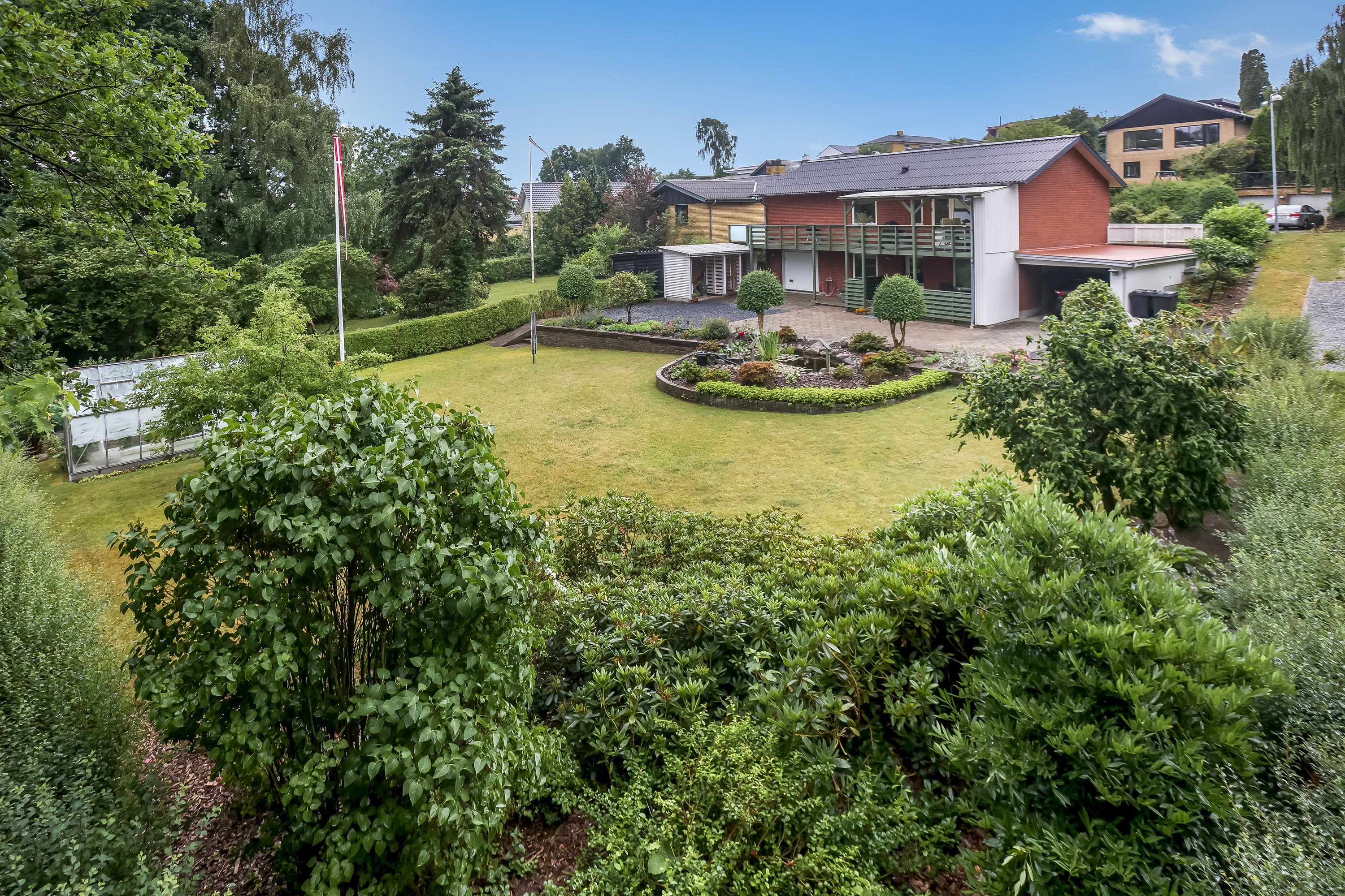 Ude venter en flot og velanlagt have med en hyggelig havedam, et drivhus og højbede samt bærbuske og en stor græsplæne med plads til leg. Haven er lukket af og omkranset af en hæk og der er etableret en stor flisebelagt indkørsel med god plads til grillhygge. Villaen ligger på en 1.018 kvm stor grund, hvor der også er anlagt en forhave med en sti, der fører op til hovedindgangen.