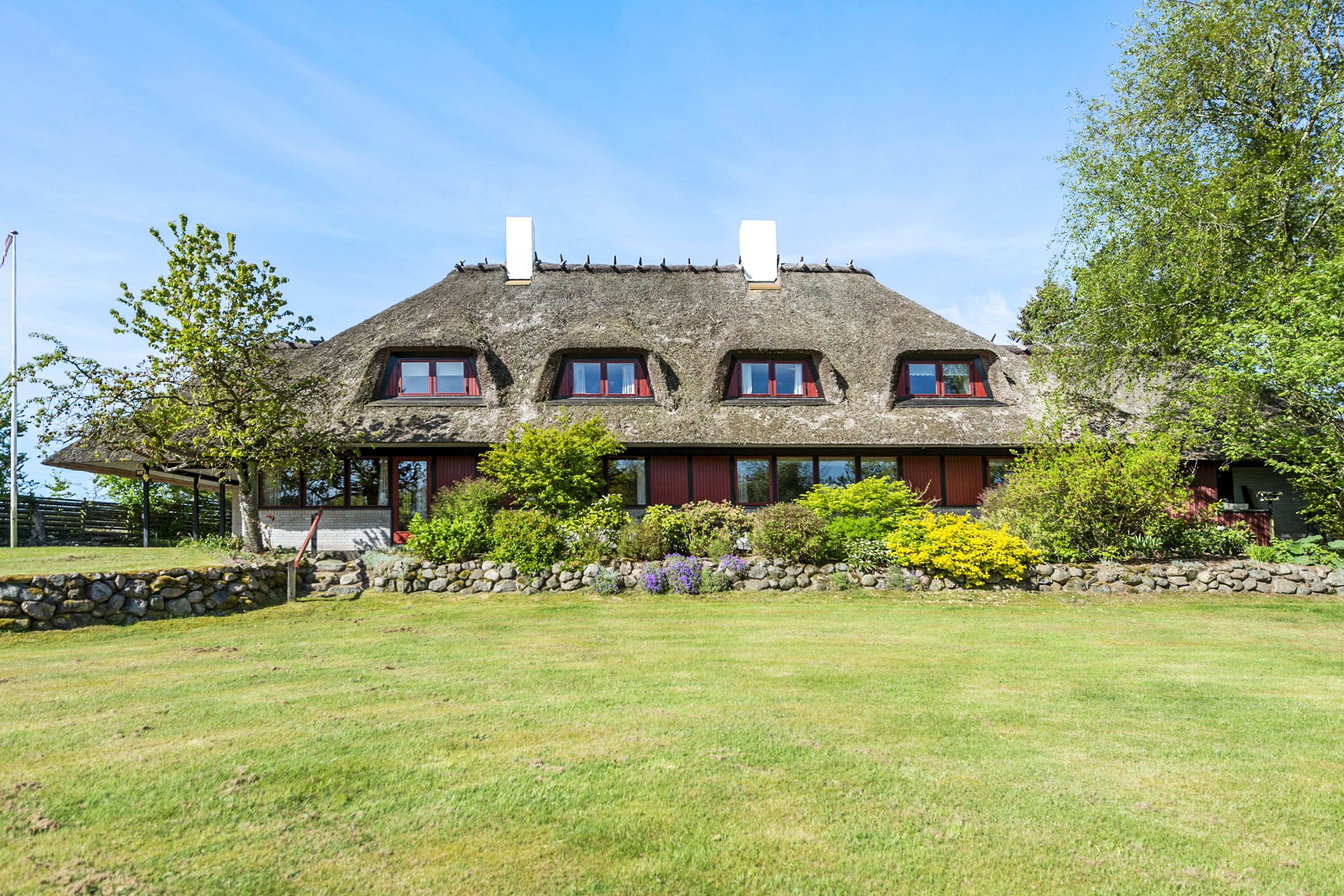 Villaen er beliggende på en kæmpegrund, som primært er udlagt i græs, delt af flotte stengærder. Her er også en rosenhave og nogle karakteristiske stenfigurer, og så er haven med terrasser alt sammen noget, hvor I kan være 100% jer selv og helt ugenerede.