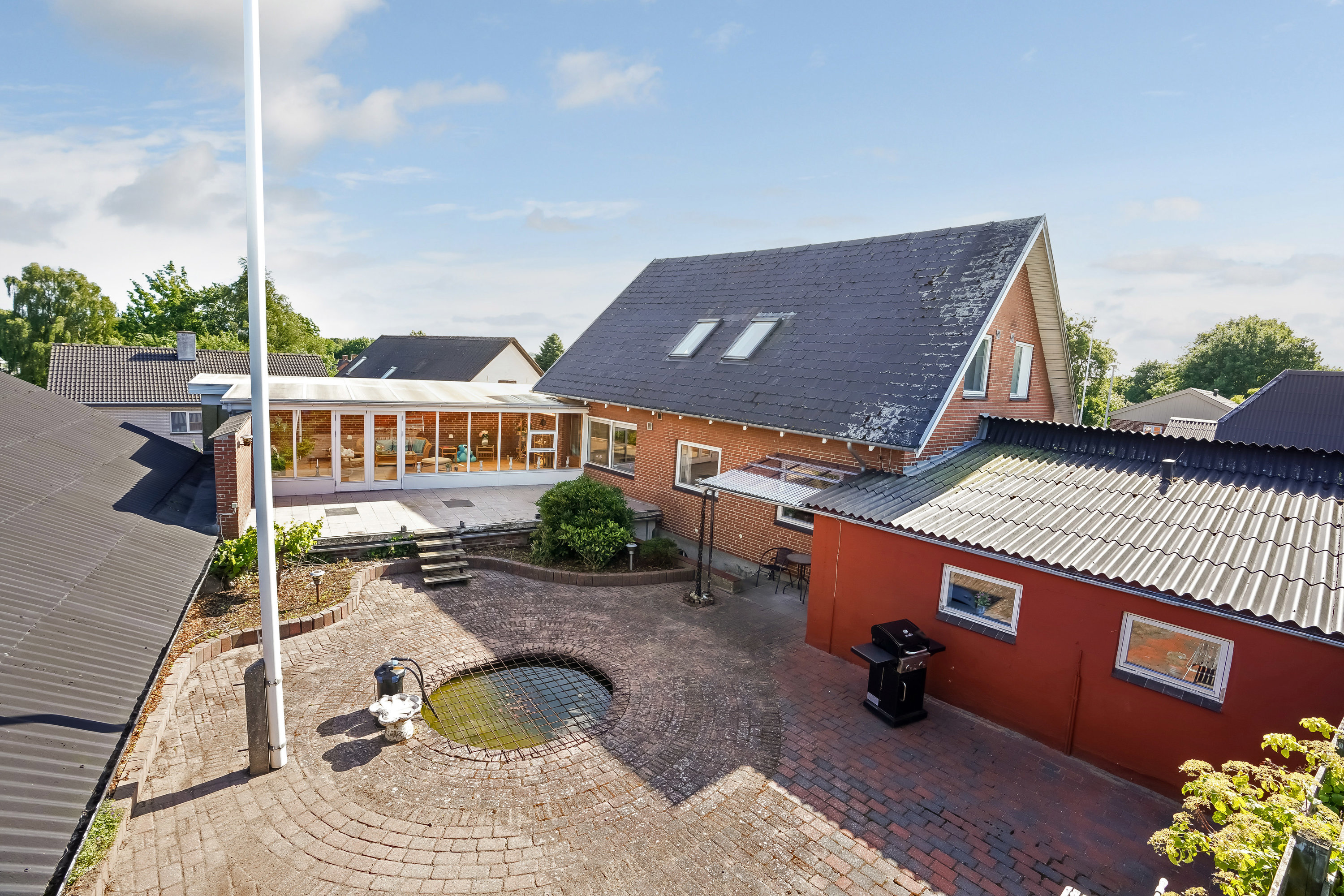 Den store grund på hele 1.382 m² giver masser af luft omkring ejendommen. Her finder du en solrig terrasse, en frodig have og rig mulighed for både leg, afslapning og udeliv – samtidig med at der stadig er god plads til parkering og adgang til værkstedet.