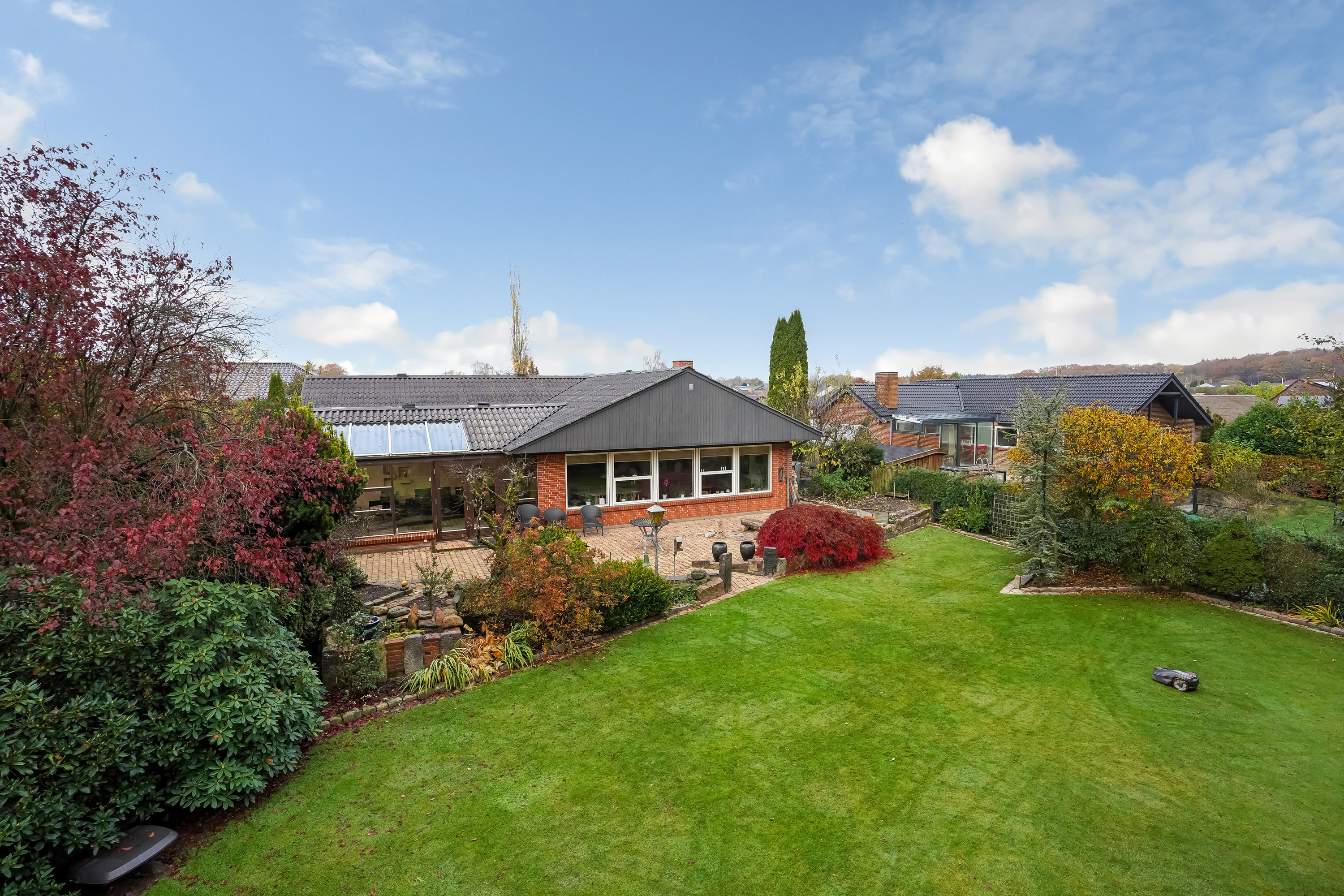Haven er et sandt fristed – privat, grøn og med direkte adgang til skoven. Her kan du nyde morgenkaffen på terrassen, tage en gåtur ad stierne eller bare lade roen sænke sig. Derudover findes carport med redskabsrum, som giver både opbevarings- og parkeringsplads.