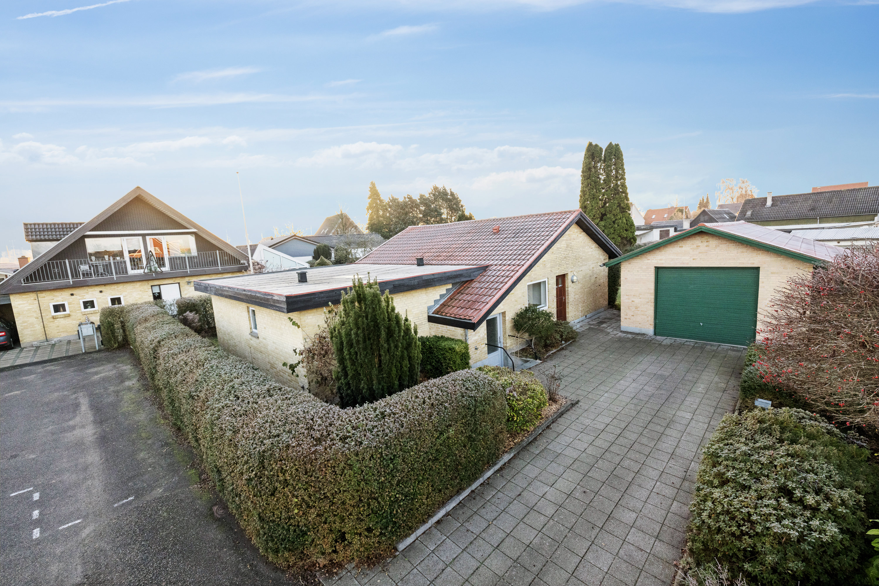 Udenfor åbner den sydvendte have sig som et stille grønt opholdssted, hvor terrassen ligger lige dér, hvor solen er aller bedst. Der er god plads at brede sig på – og det gælder også den rummelige garage, som uden besvær rummer både bil og alt det udstyr, man samler op gennem årene. Det store udhus giver endnu et lag af fleksibilitet.