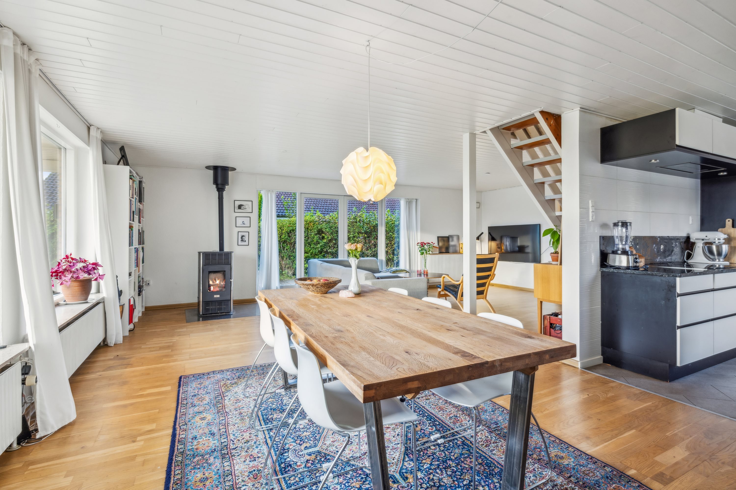Den store børnefamilie på udkig efter en solid base skal læse med nu, når vi præsenterer en gedigent 70’er-villa, der tager sig så fint og indbydende ud med hvidt træværk og solbrændte sten. Her er god plads til bilen på fliserne foran huset, og I bliver så glade, for I bliver forkælet med en pæn forhave, der blev anlagt så sent som i foråret. Her skal I boltre jer på blødt græs, mellem pæne bede og saftige frugttræer. Derudover er den 1.012 kvm store grund simpelt indrettet, og her er altså rig mulighed for at I kan folde de store havedrømme ud. Skulle I derimod have lyst til en mindre og mere overskuelig have, er der også mulighed for at udstykke den bagerste del af grunden. Lad os træde indenfor i villaen, hvor jeres nye hjem omfavnes af en dejlig hjemlig atmosfære. De 170 kvm tager sig fint ud og det hele føles lyst og luftigt. Det velindrettede hjem tager godt hånd om såvel praktikaliteterne som familielivet, for her er masser af skabs- og opbevaringsplads, mens samværet virkelig kommer i fokus med det skønne leverum: Det pæne, tidløse køkken ligger i åben forbindelse til stuen og spisestuen, hvor brede vinduespartier og den knitrende brændeovn sætter stemningen. Dertil kommer husets to pæne badeværelser og det stilrene bryggers samt fire gode værelser. Og lagde I mærke til førstesalens pragtfulde altan? 200 meter – så langt har børnene til skole, mens de mindste ikke skal fragtes mere end 600 meter til daginstitutionen. De daglige indkøb kan I klare i Netto, der ligger lige ovre på den anden side af gaden, og så tager det bare fem minutter at cykle til Viborg Syd Idrætscenter. Ja, hverdagen bliver som en leg her i Viborg! Mellem arbejde, skole, indkøb og fritidsaktiviteter kan man godt have brug for ro til hovedet, og det finder I heldigvis ganske tæt på. Søg for eksempel ind under de høje træer i Viborg Plantage, eller skulle det hellere være en tur rundt om Søndersø?