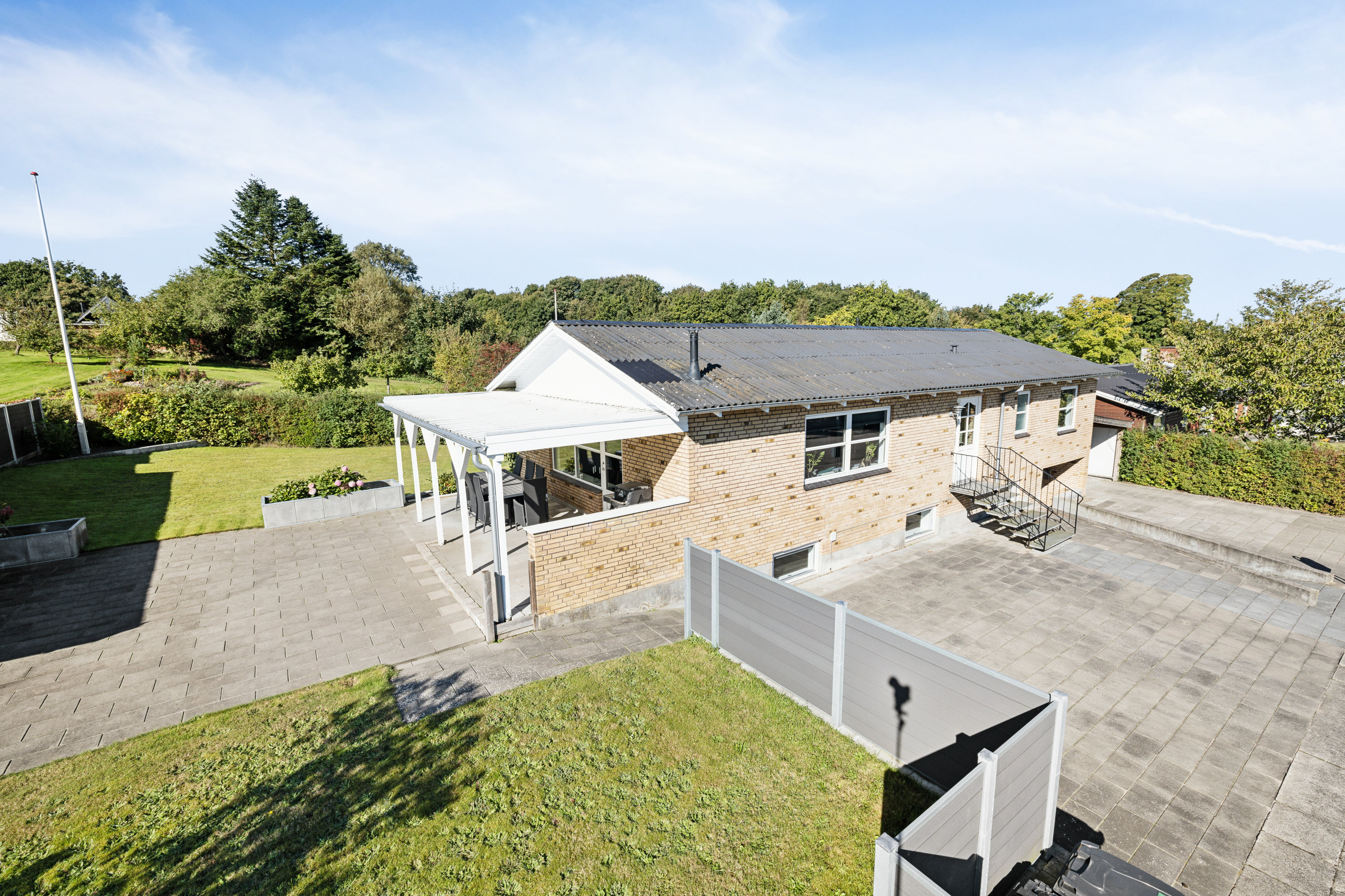 Udenfor er terrasserne strategisk placeret i forhold til solens bane. Den ene ligger stik syd og er delvist overdækket, så her kan I nyde varmen hele dagen, og i løbet af eftermiddagen kan I søge om på den vestlige, nyere del for at indtage eftermiddagskaffen i lune omgivelser. Imens kan børnene tumle rundt på plænen, bilen kan parkeres i garagen, og så skal det selvfølgelig nævnes, at sælger selv siden 2020 løbende har istandsat udenfor med f.eks. bede og vedligeholdelsesfrit hegn.
