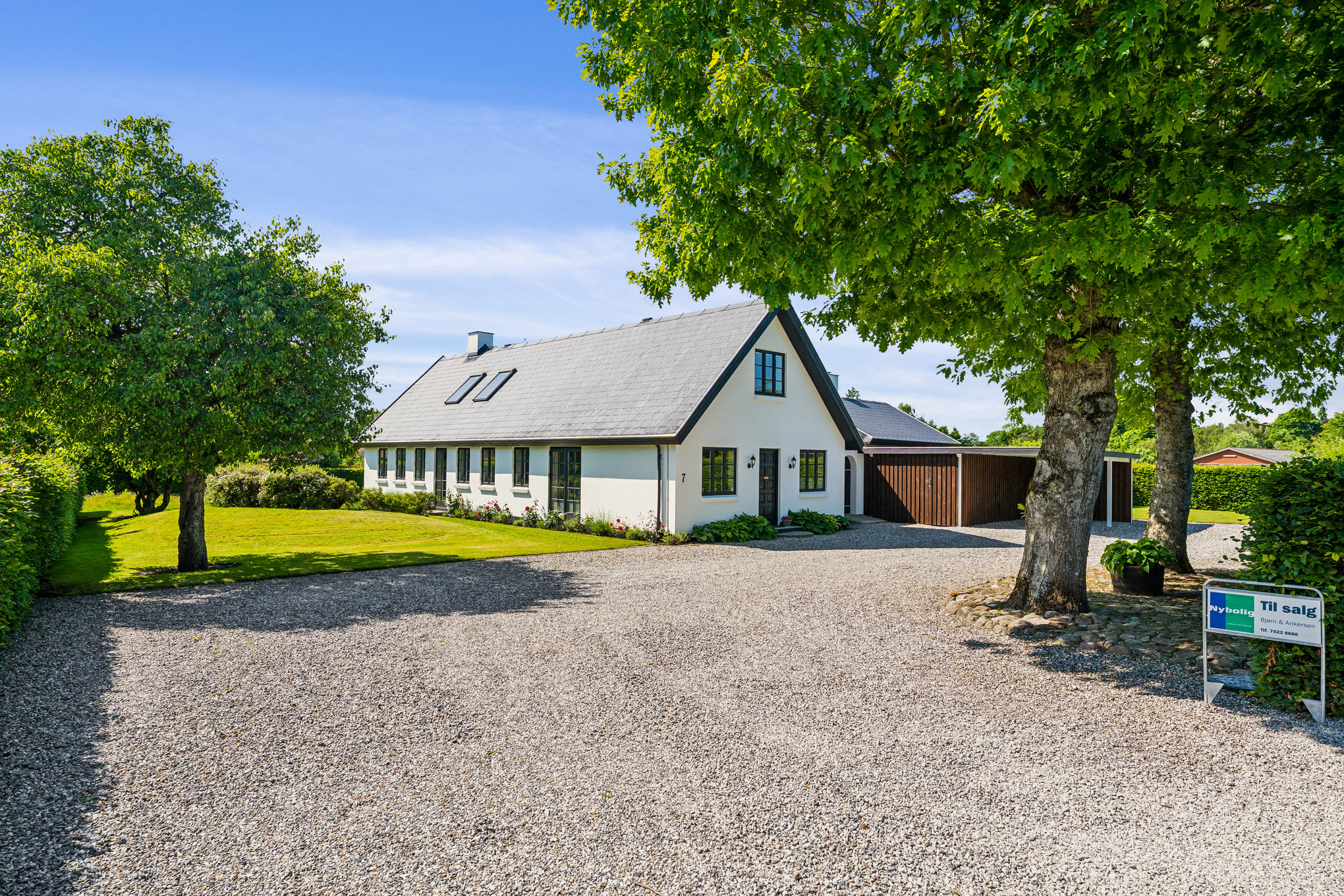 Ejendommen fremstår nydeligt vedligeholdt med charmerende detaljer, der er med til at give huset sit særlige præg. Udefra mødes I af den klassiske, hvide facade med sprossevinduer, som sætter stemningen for den landlige idyl, der kendetegner hele ejendommen. Den store grund på 2.357 m² sikrer masser af plads, privatliv og skønne uderum, der indbyder til både afslapning og leg.