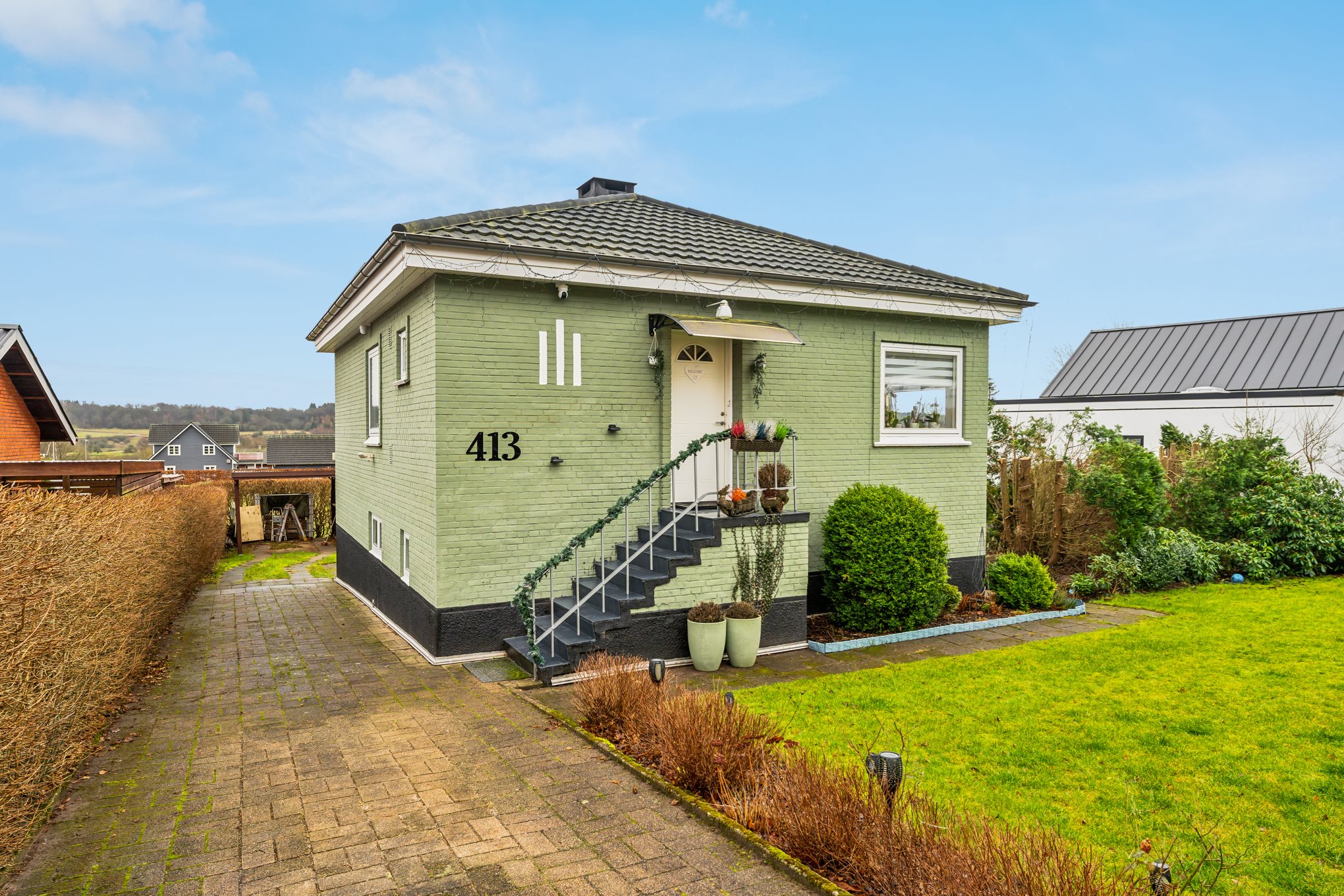 Huset, som fik installeret solceller i oktober 2024, står på en 720 kvadratmeter stor og skrånende grund. Først ser man indkørslen, forhaven og indgangspartiet, men allerede herfra aner man udsigten. Baghaven, som vender mod syd, nyder virkelig godt af udsigten, og udestuen med terrassen i forlængelse kommer således både med panoramaudsigt og sol hele dagen lang. Derudover frister haven med både drivhus og små højbede.