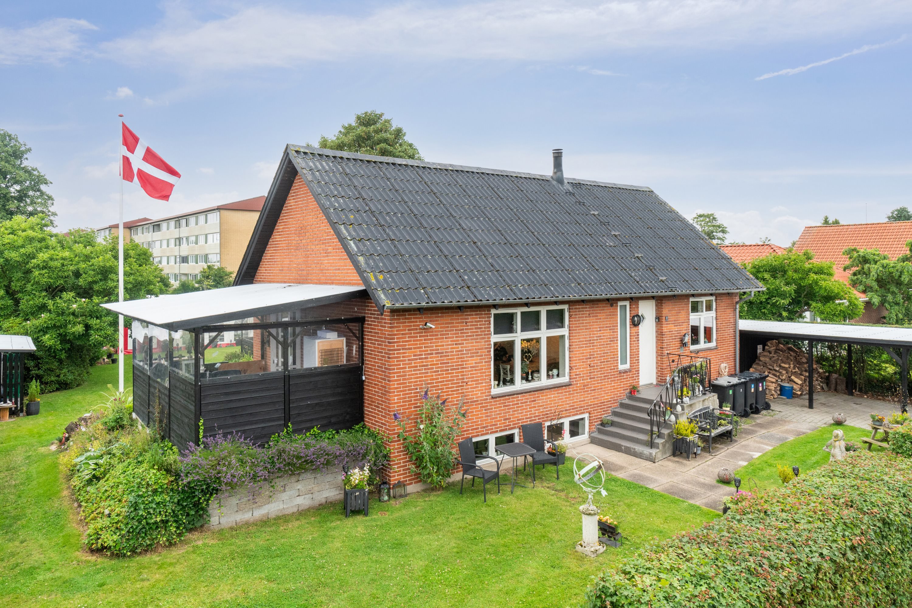 Udendørs finder du en nem og overskuelig have. Haven rummer samtidig muligheder for at skabe en hyggelig oase med plads til både leg og afslapning. Derudover rummer boligen flere terrasser, så du kan fange solens stråler hele dagen. Udhuset/annekset er et lille "hus" for sig. Det er opvarmet med varmepumper, og er isoleret og indrettet med køkken, som har alt i hvidevarer samt en garage, der er omdannet til stue. Her er der klinker på gulvene og endnu en brændeovn.