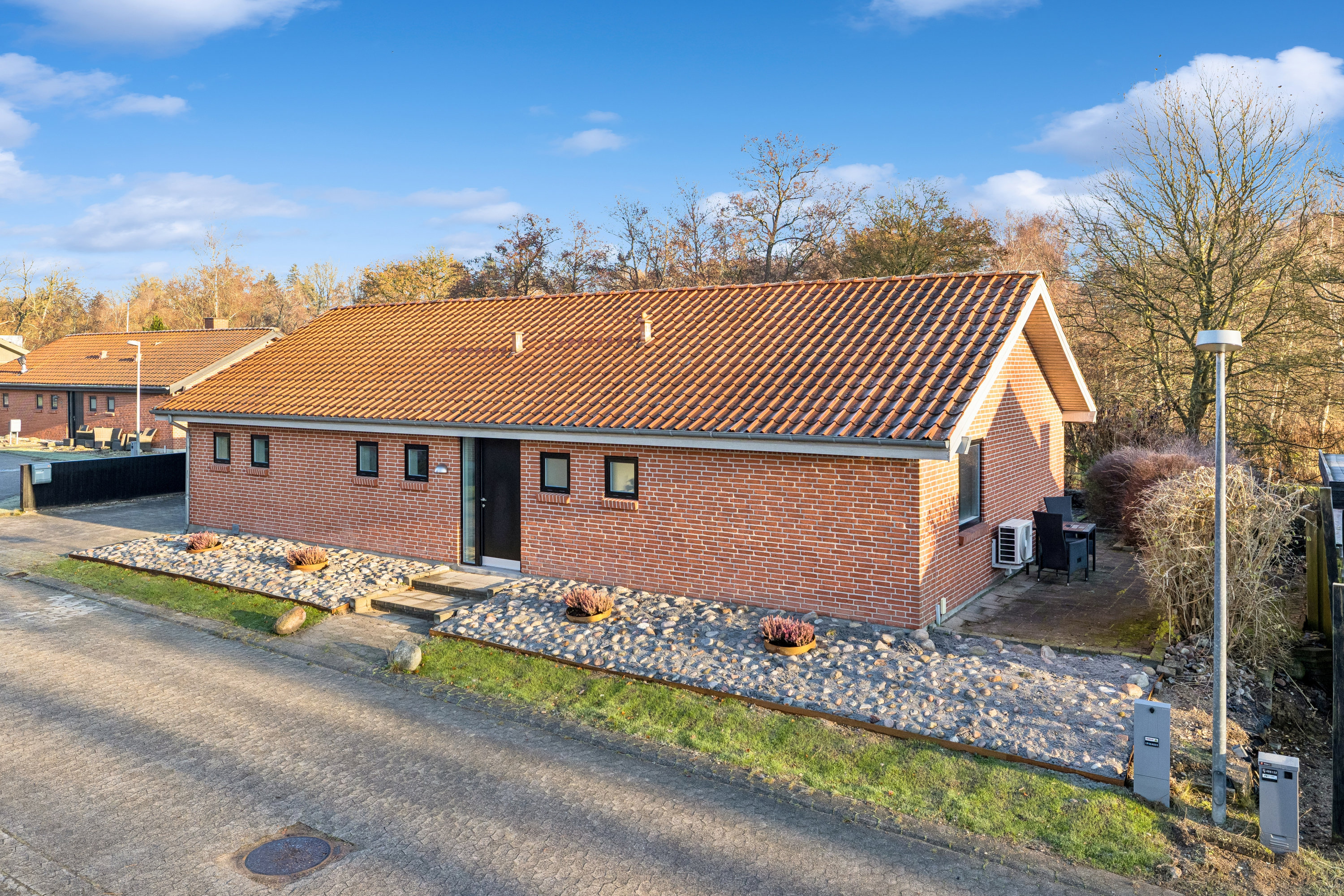 Huset byder på en gennemtænkt planløsning med tre gode soveværelser, som giver plads til familien, gæster eller hjemmekontor. Det store, åbne alrum, der kombinerer stue og spisestue, er hjemmets naturlige samlingspunkt med masser af lys og direkte adgang til den store, delvist overdækkede terrasse – perfekt til hyggelige måltider og udendørs samvær med udsigt til åen og Doktorparken.Det moderne køkken har hvide fronter, grå bordplader, integrerede AEG-elementer og en Quooker, som gør madlavning og hverdagsrutiner ekstra nemme. Hele huset er udstyret med gulvvarme, der sikrer behagelig varme året rundt. Det rummelige bryggers har god plads til vaskefaciliteter og opbevaring samt adgang til carporten.