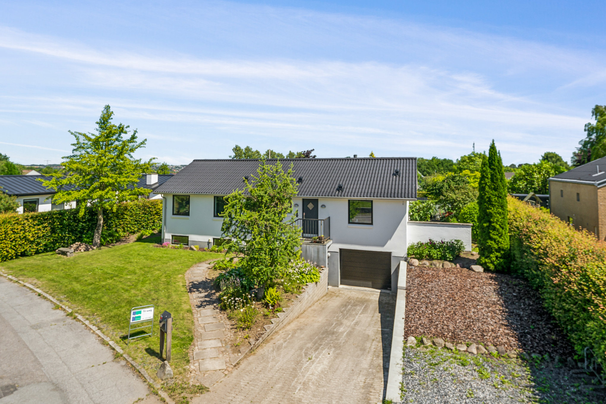 Udenfor venter lige så velholdt et ydre med nyere tag og pæne udearealer. Parkér trygt bilen i garagen, og lad den hyggelige forhave byde jer velkommen. Bagtil får I en solrig have med masser af plads til både fodbold og leg samt afslapning på terrassen – og dem med grønne fingre kan glæde sig over drivhuset og de mange velplejede bede.