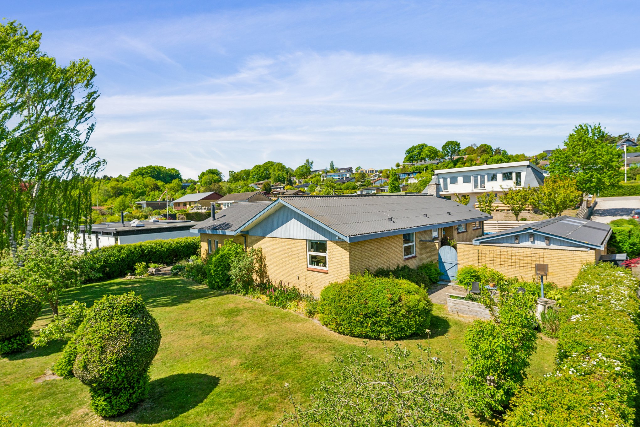Forhaven med flisebelagt indkørsel skaber et godt førstehåndsindtryk, og når bilen er parkeret i carporten med tilhørende redskabsskur/værksted, kan I bevæge jer om i baghaven, der er noget for sig. I første parket til åbne vidder finder I her en stor, sydvendt plæne med træer, blomsterbede og buske. En sand grøn oase, der fortsætter, som I bevæger jer rundt om huset. En gårdhave skaber nemlig flere gode uderum og hyggekroge med bl.a. en overdækket terrasse og et orangeri, der fungerer som en lille udestue.