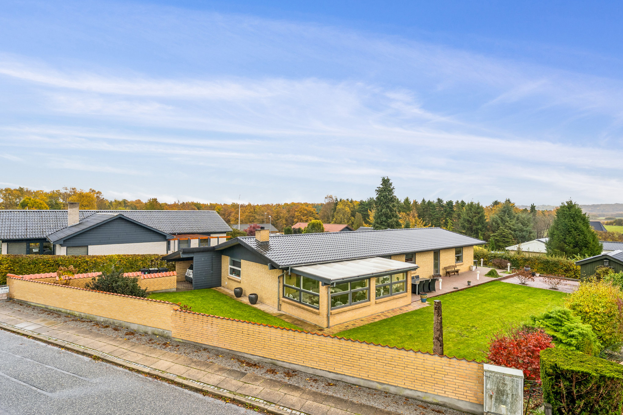 Udenfor fortsætter den behagelige stemning på en velanlagt matrikel, hvor der er rum og ro til at nyde udelivet. Den nydelige gulstensvilla fremstår pæn og velholdt, og haven er lige så indbydende, som den er nem at passe. En flisebelægning fører hele vejen rundt om huset og inviterer til at følge solen fra morgen til aften. Når temperaturen daler, kan I rykke ind i den store udestue, hvor I stadig kan nyde lyset og udsigten til haven. Og bilen? Den holder tørt og godt i carporten.