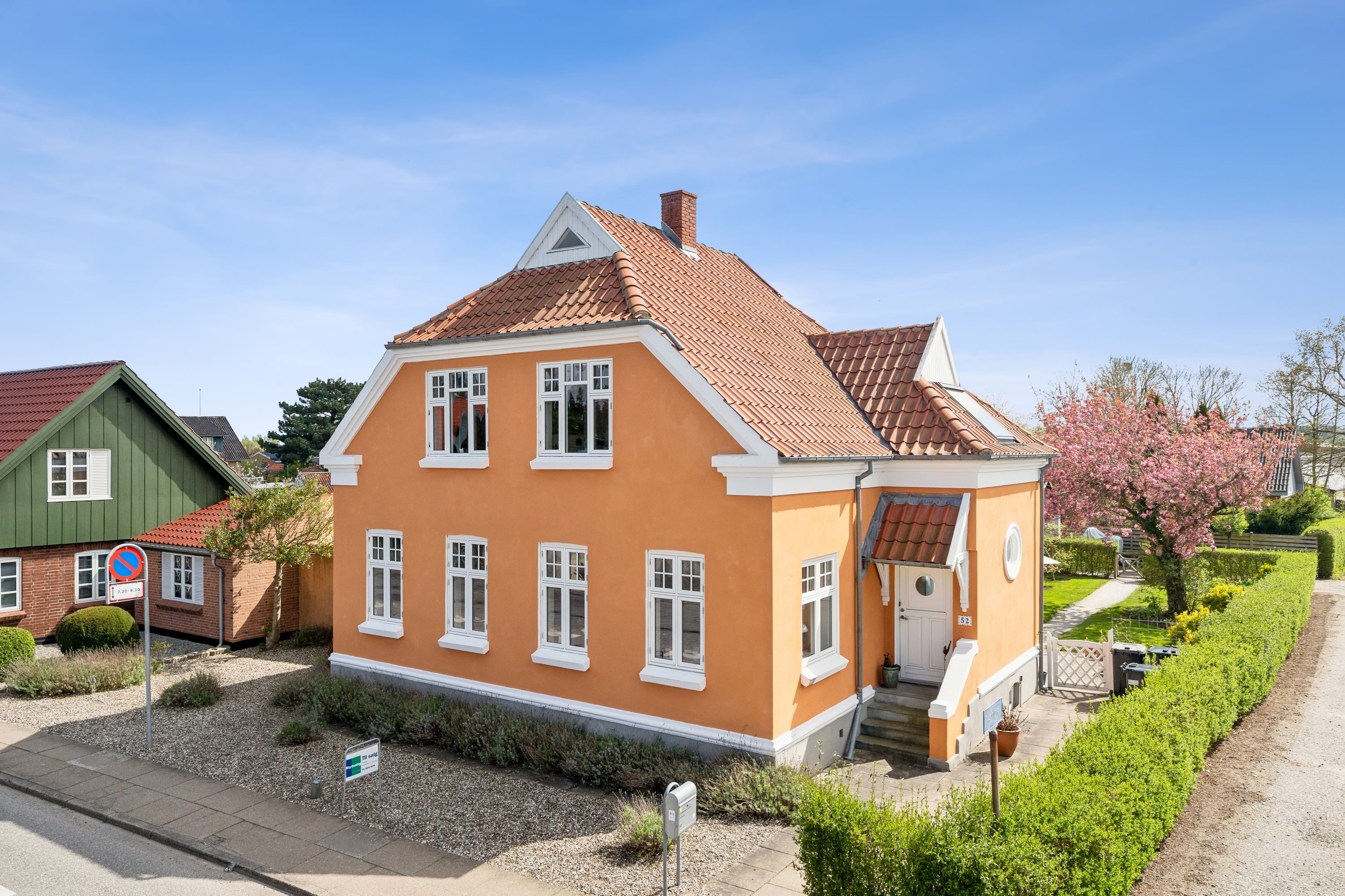 En lille sti fører jer fra carporten mod villaen, og som I bevæger jer gennem havens skønne oase, vil I få følelsen af at være taget en tur til Gl. Skagen. Den smukke murermestervilla står med en flot facade i den helt rette farve, mens fine, sprossede vinduer lader lyset strømme ind i hjemmet. Der er passet utrolig godt på det fantastiske hus, som byder på sjæl og charme fra kælder til kvist. 40 bonuskvadratmeter findes i kælderen, mens stueetagen folder sig ud med højloftede leverum. Nyd synet af ild i brændeovnen, originale trægulve og detaljerige stuklofter! I får en stor stue med åben forbindelse til et lyst køkken-alrum, der på varme sommerdage vil smelte sammen med den sydvendte have – en drøm af et uderum! Prikken over i’et er førstesalen med et pænt badeværelse og gode værelser. Og beliggenheden? Den er også i top. I bor trygt i Dronningborg – ikke langt fra hverken bylivet eller fjorden og helt tæt på bl.a. indkøb og skole.