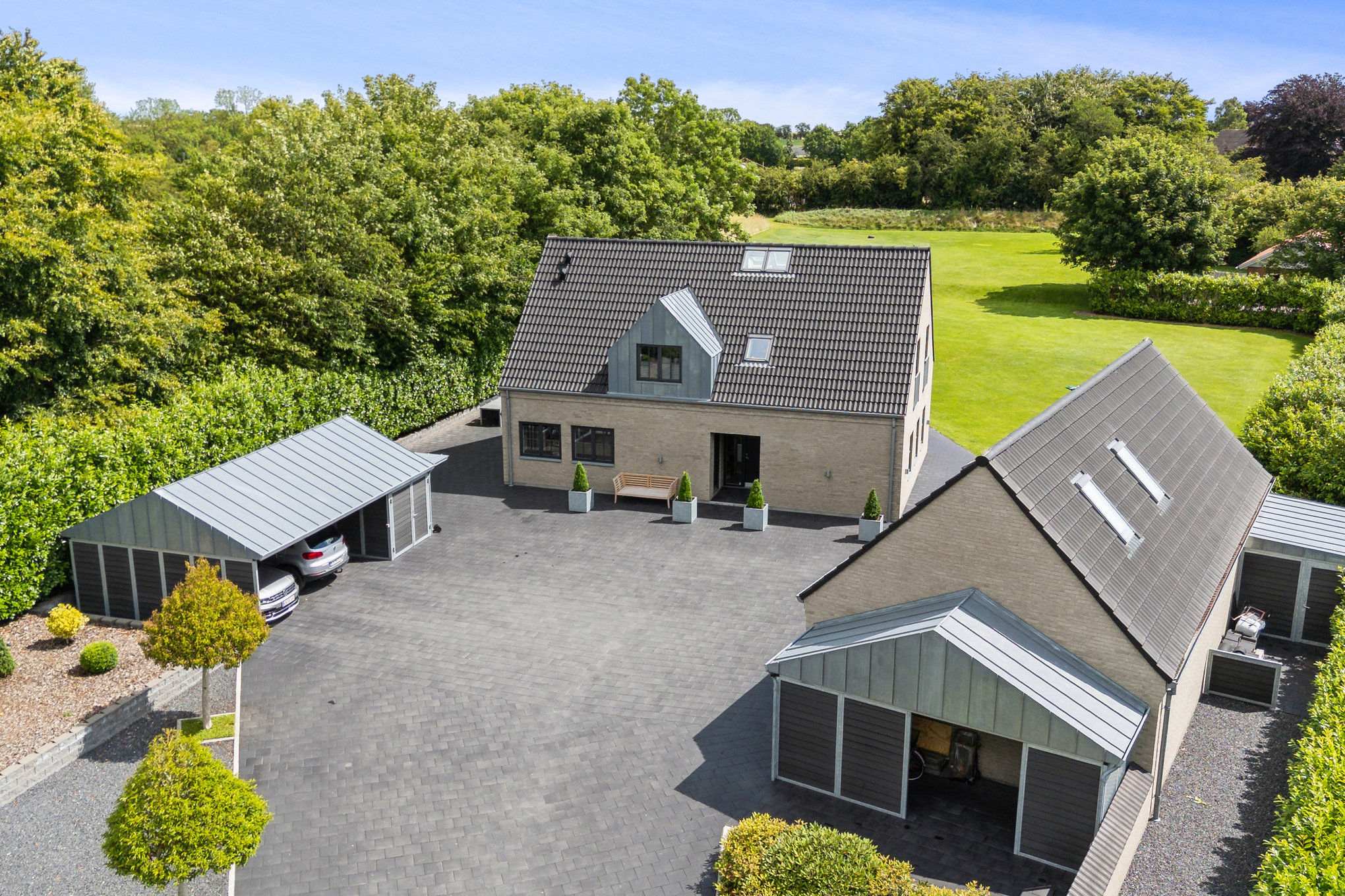En halvmur i lyse mursten og en bred fliseindkørsel byder jer velkommen til ejendommen, og rundt om gårdspladsen ligger den dobbelte carport, den 90 kvm store garage og den flotte, fuldmurede villa. Huset blev bygget i 2013 af de nuværende ejere, og de 237 boligkvadratmeter er gennemtænkt fra top til tå.