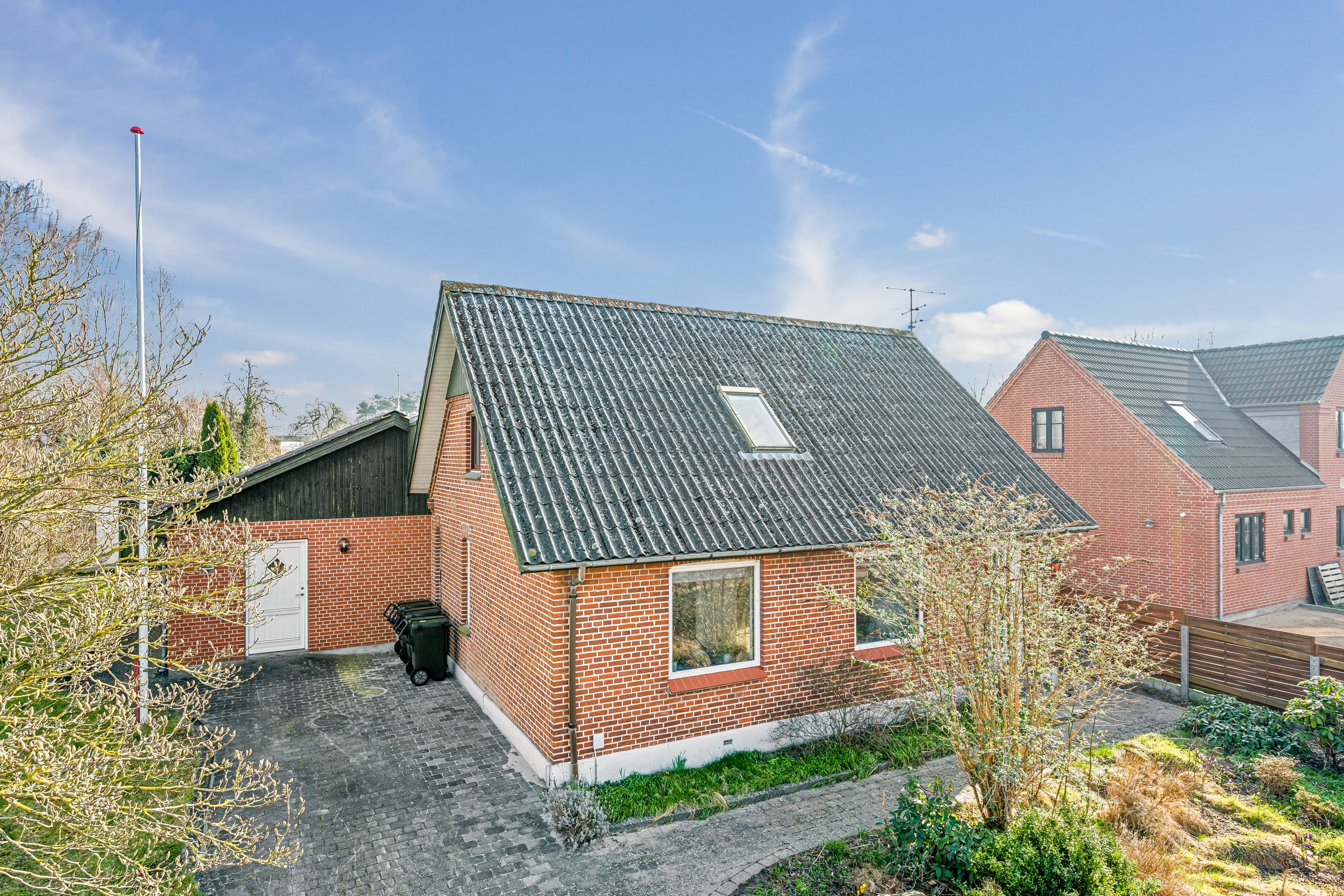 Villaen, opført i røde sten, er beliggende på en stor og ugeneret grund. Haven er praktisk anlagt med græs og terrasser med flisebelægning. Her er masser af muligheder for at nyde udelivet med god plads til leg og aktivitet og terrasser til hyggelige sommeraftener.